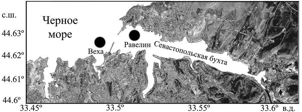 Пробы для определения хлорофилла–а (1 л) и фитопланктона (1.5 л) отбирались пластиковым ведром в ходе множественных экспедиций с борта маломерных судов ФИЦ ИнБЮМ, примерно в одних и тех же координатах двух близко расположенных (~2.5 км) станций: Веха (Севастопольское взморье) 2013–2021 гг. и Равелин (устьевая зона Севастопольской бухты) 2008–2021 гг., представленных на карте (рис. 1).
