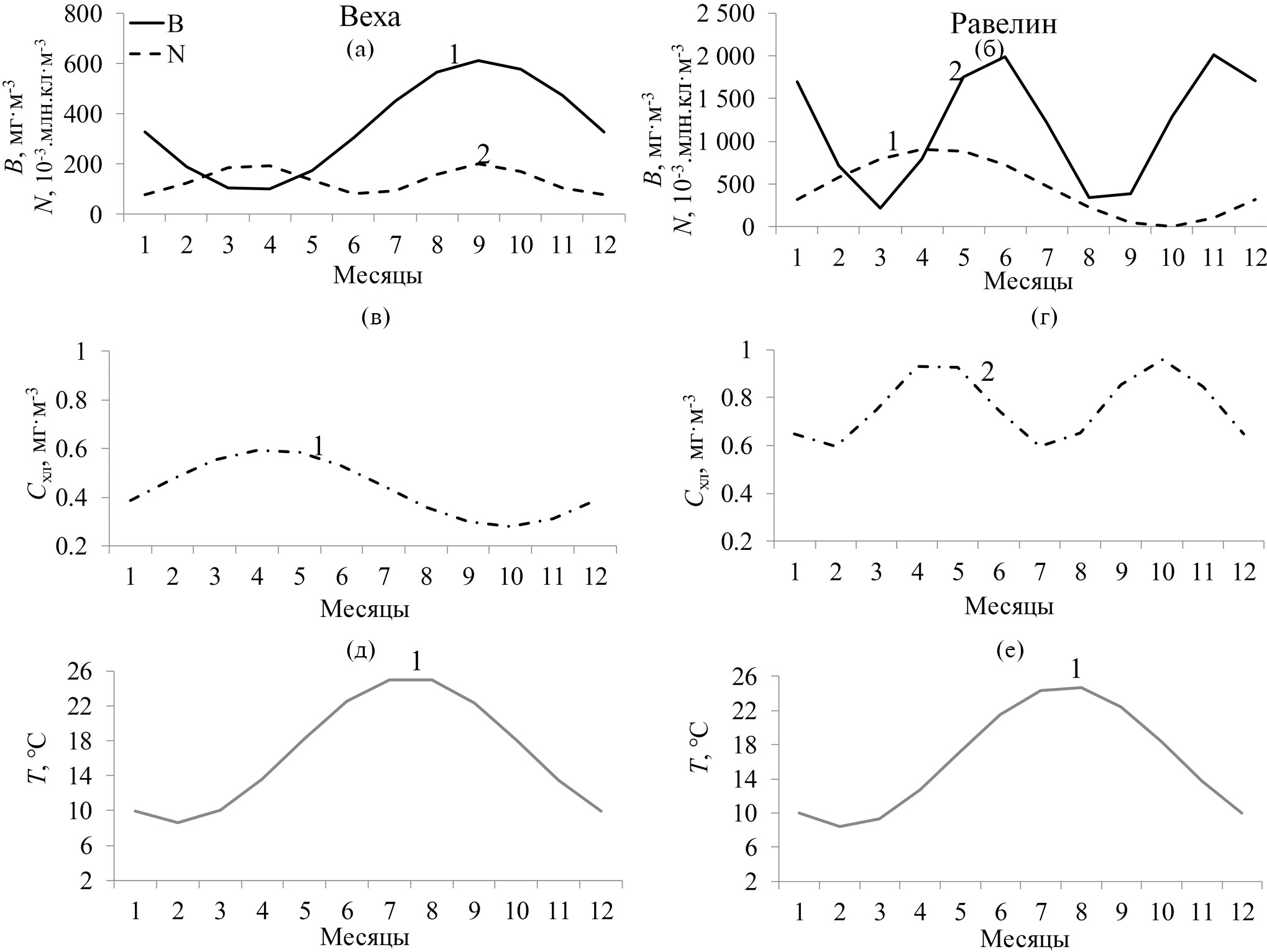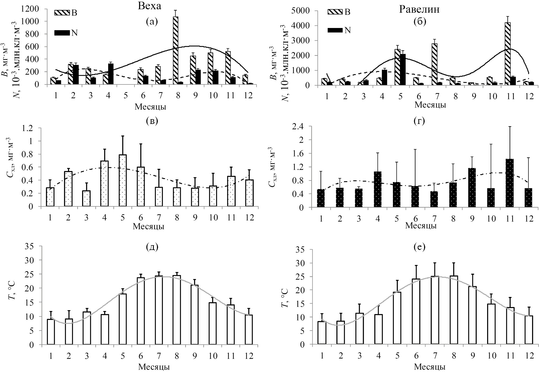 Сезонный цикл изменчивости показателей фитопланктона и температуры воды на станциях Веха и Равелин в 2013–2014 гг. На ст. Веха значения N варьировали в пределах от 20 до 309 · 10–3 млн кл. · м–3, B – от 242 до 1010 мг · м–3, Cхл – от 0.2 до 0.8 мг · м–3. На ст. Равелин N изменялась в течение всего сезонного цикла в пределах от 33 до 2105 · 10–3 млн кл. · м–3, B – от 200 до 4185 мг · м–3, Схл – от 0.5 до 1.4 мг · м–3. Анализ сезонной динамики показателей фитопланктона, аппроксимированных полиномами 4-го порядка на ст. Веха показал максимум численности в феврале–марте и октябре–ноябре, максимум биомассы – в сентябре (рис. 2а), концентрации хлорофилла–а – в апреле–мае (рис. 2в). На ст. Равелин максимумы средней численности фитопланктона зарегистрирован в апреле–мае и ноябре, биомассы – в ноябре (рис. 2б), концентрации хлорофилла–а – в апреле–мае и ноябре (рис. 2г). Годовой цикл температуры в 2013–2014 гг. четко выражен на обеих станциях: с максимумом летом (июль–август) (25.0 ± 0.5°C) и минимумом – зимой (январь–февраль) (9.0 ± 0.2°C) (рис. 2д, е).