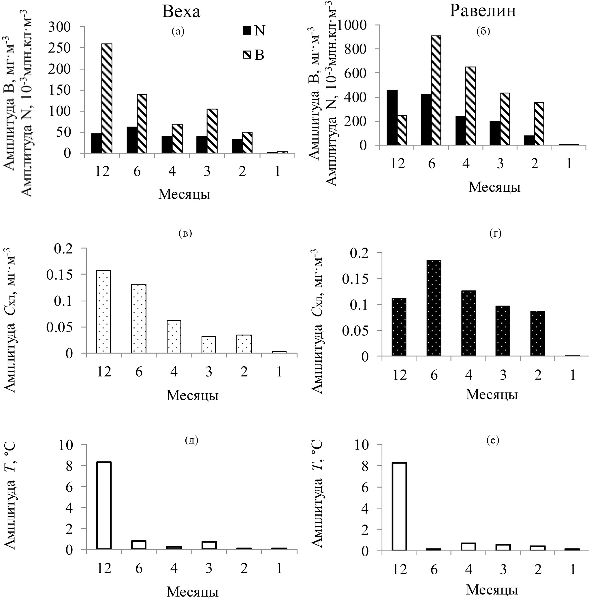 Рис. 4. Амплитудно-периодные характеристики численности и биомассы фитопланктона (а, б), концентрации хлорофилла–а (в, г) и температуры воды (д, е) на ст. Веха и Равелин.