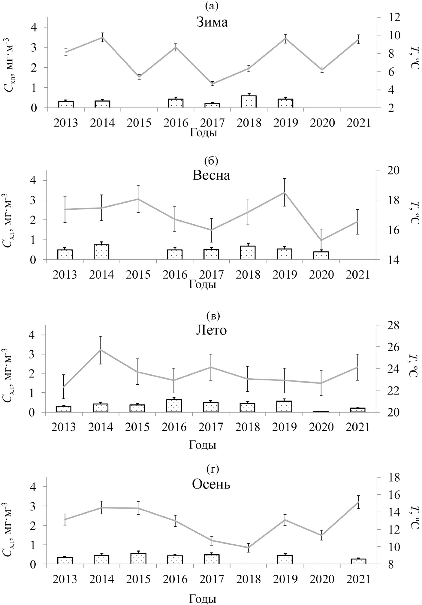 Схл, мг · м–3 | Веха | 0.39 ± 0.09 | 0.56 ± 0.27 | 0.40 ± 0.19 | 0.42 ± 0.16 | 0.45 ± 0.01 | 2013–2021 |
