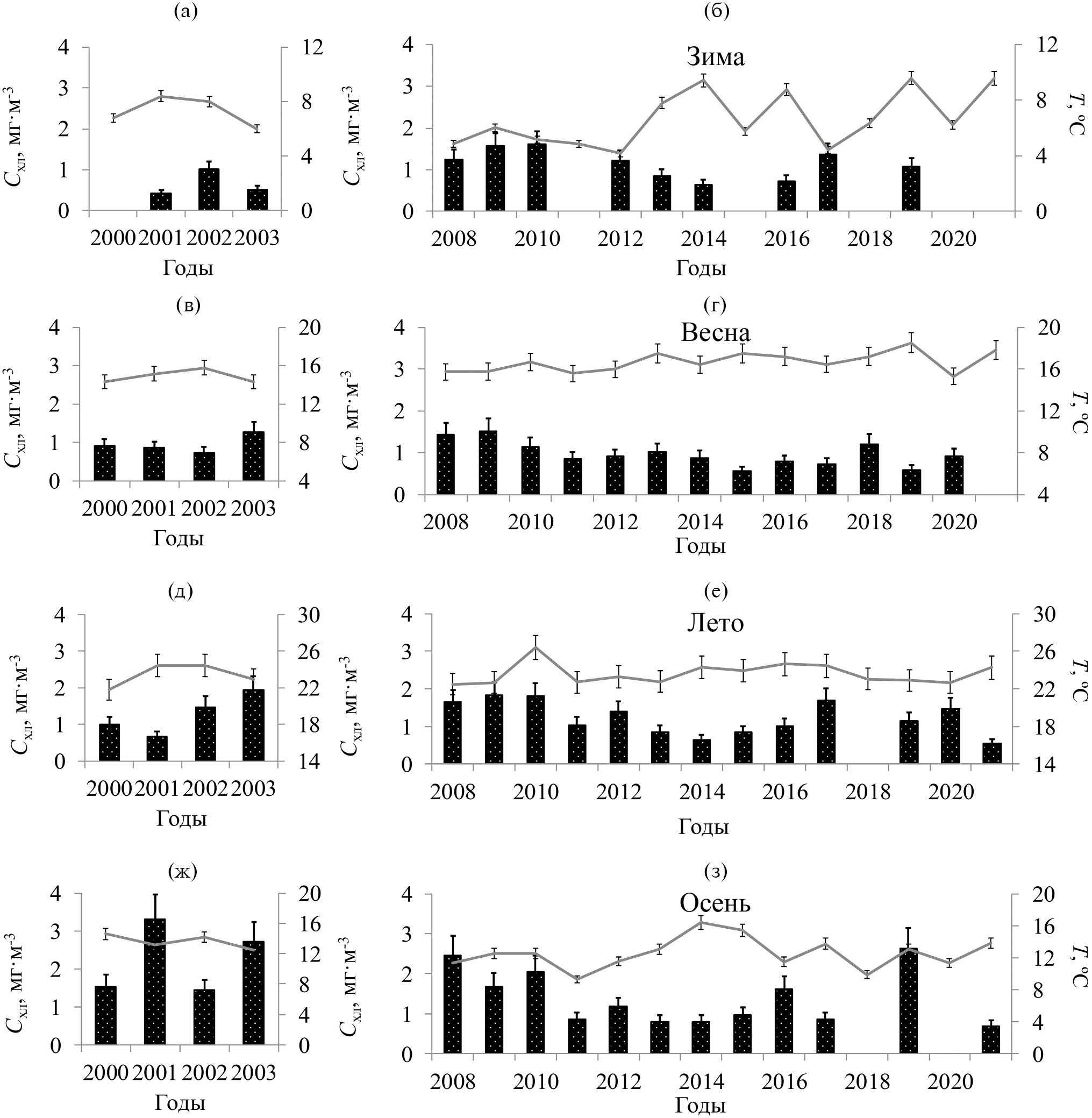 Рис. 6. Межгодовая динамика зимней (а, б), весенней (в, г), летней (д, е) и осенней (ж, з) концентрации хлорофилла–а и температуры воды в 2000–2003 гг. по работе [20], в 2008–2021 гг. по собственным данным на ст. Равелин. Вертикальные тонкие линии – ± σ.