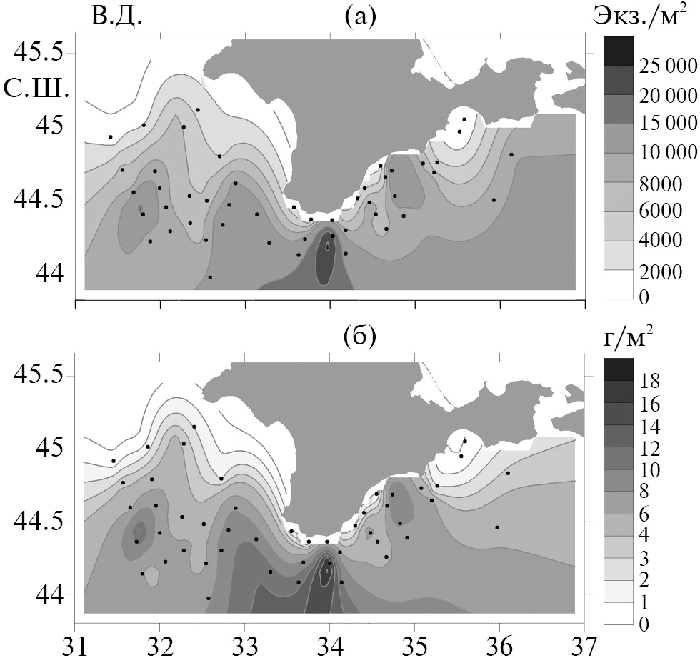 В исследуемом секторе Чёрного моря в ноябре 2017 г. плотность популяции C. euxinus варьировала в широких пределах: от 0.1 и 0.4 тыс. экз/м2 и 0.03 и 0.04 г/м2 на ст. 21 и 25 внутреннего шельфа Феодосийской бухты до 29.3 тыс. экз/м2 и 20.5 г/м2 в зоне конвергенции течений у ЮБК на ст. 7 (рис. 2).