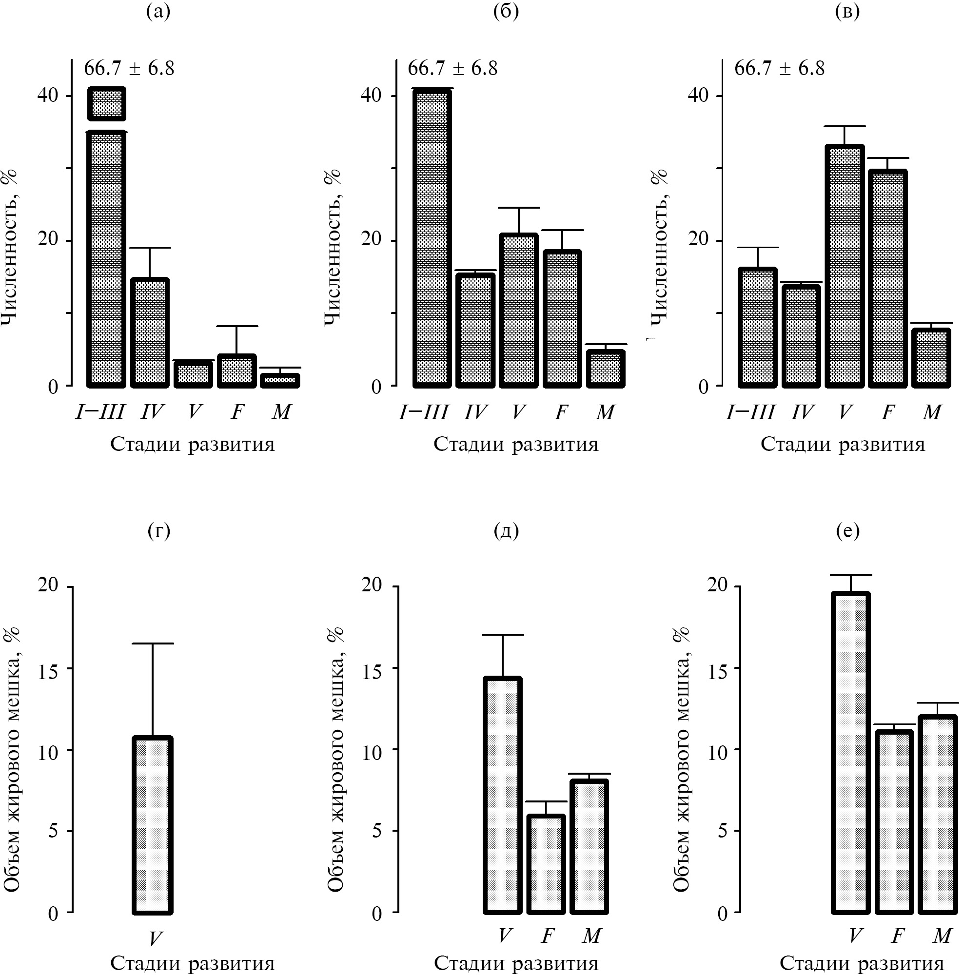 Рис. 4. Структура популяции (% общей численности особей) (а–в) и объём жирового мешка (% объёма тела) (г–е) у Calanus euxinus на внутреннем (а, г) и внешнем (б, д) шельфе, а также в глубоководных районах эпипелагиали (в, е) Чёрного моря в ноябре 2017 г. I–III, IV, V – копеподиты; F – самки; M – самцы.