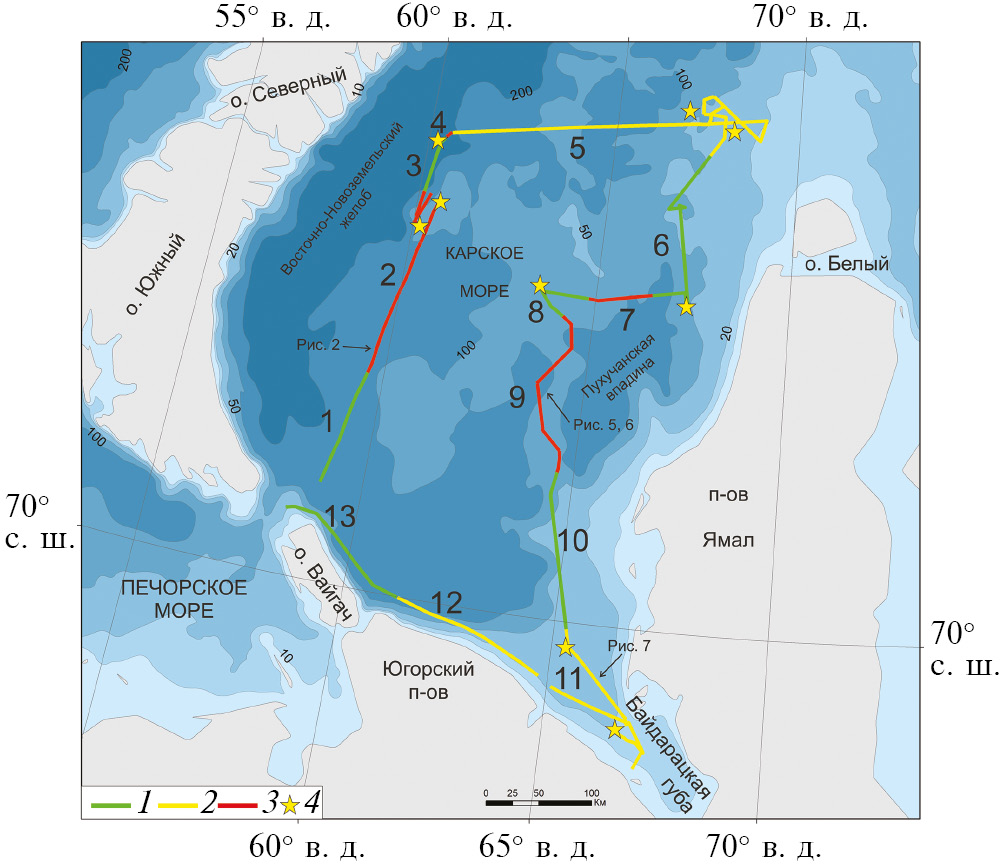 Рис. 1. Участки районирования распределения борозд выпахивания на дне Карского моря по маршруту 52-го рейса НИС “Академик Николай Страхов”: 1 – участки без борозд, 2 – участки с низкой плотностью борозд, 3 – участки с высокой плотностью борозд, 4 – участки полигональной съемки.