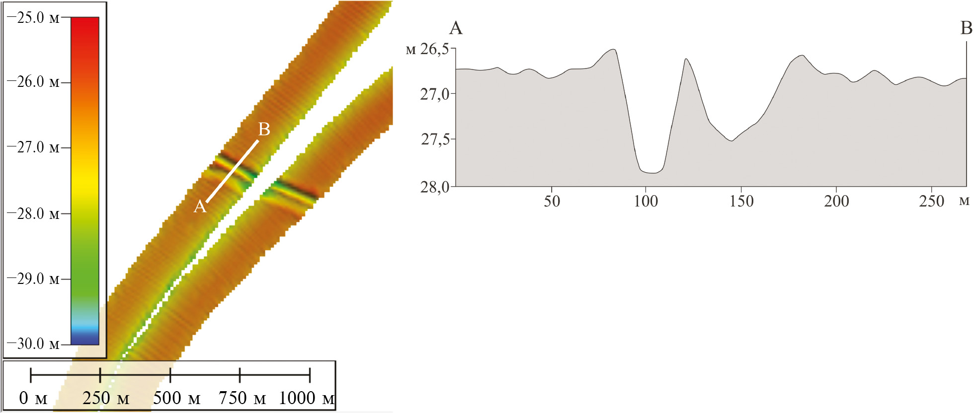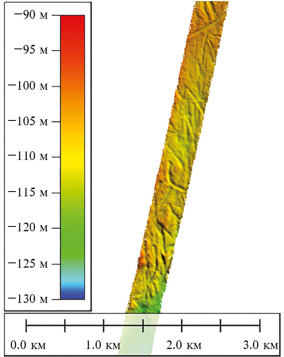 Результаты съемки сохраняются программным комплексом в формате .log, после чего происходит их обработка. На этапе перед началом съемки оператором настраиваются программные фильтры по глубине и качеству сигнала (в зависимости от ожидаемых на участке глубин), иногда выполняется настройка дополнительных фильтров, таких как угловой, фильтр с применением метода скользящего среднего и других. Задаются параметры скорости звука в водной среде, измеренные на станциях в ходе рейса. Затем, после сохранения данных на носителе, происходит ручная постобработка материалов оператором. Отсев и удаление лучей, данные которых выглядят ошибочными или неточными, происходит экспертным методом. В отдельных случаях, при некорректной работе некоторых приборов (нарушенной стабилизации гирокомпаса при штормовой погоде и т. п.) или других программных ошибках в данных, на стадии конвертации ЦМР из первичного формата в формат .asc, применяются программные настройки для исправления искривлений, невязок и т. п. Для построения результирующей ЦМР, пригодной для обработки и дешифрирования борозд, из исходного файла задаются настройки разрешения (ЦМР в данном случае строились с размером пикселя 10 × 10 м), способа осреднения данных и настройки отображения. Таким образом, результирующая ЦМР (рис. 2) имеет разрешение 10 м в плане и от 0.1 до 1.0 м по глубине, что сильно зависит от погодных условий.