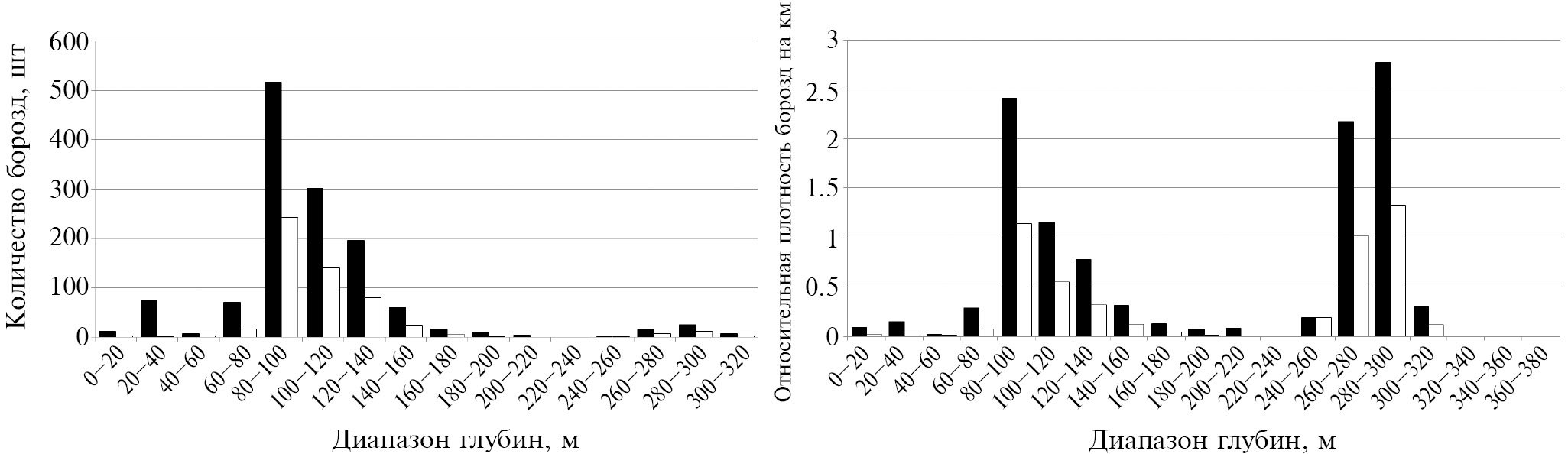 Рис. 3. Распределение (слева) и относительная плотность (справа) борозд выпахивания по 20-метровым диапазонам глубин. Черным – все борозды, белым – крупные борозды.