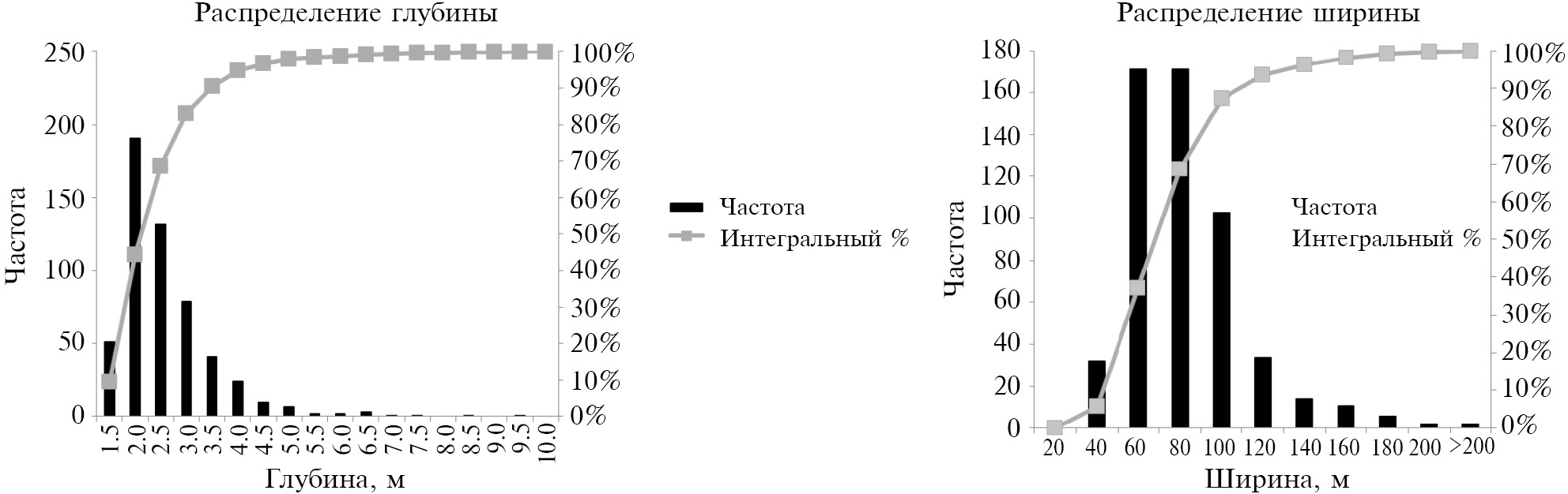 Рис. 4. Распределение значений глубины и ширины борозд выпахивания
