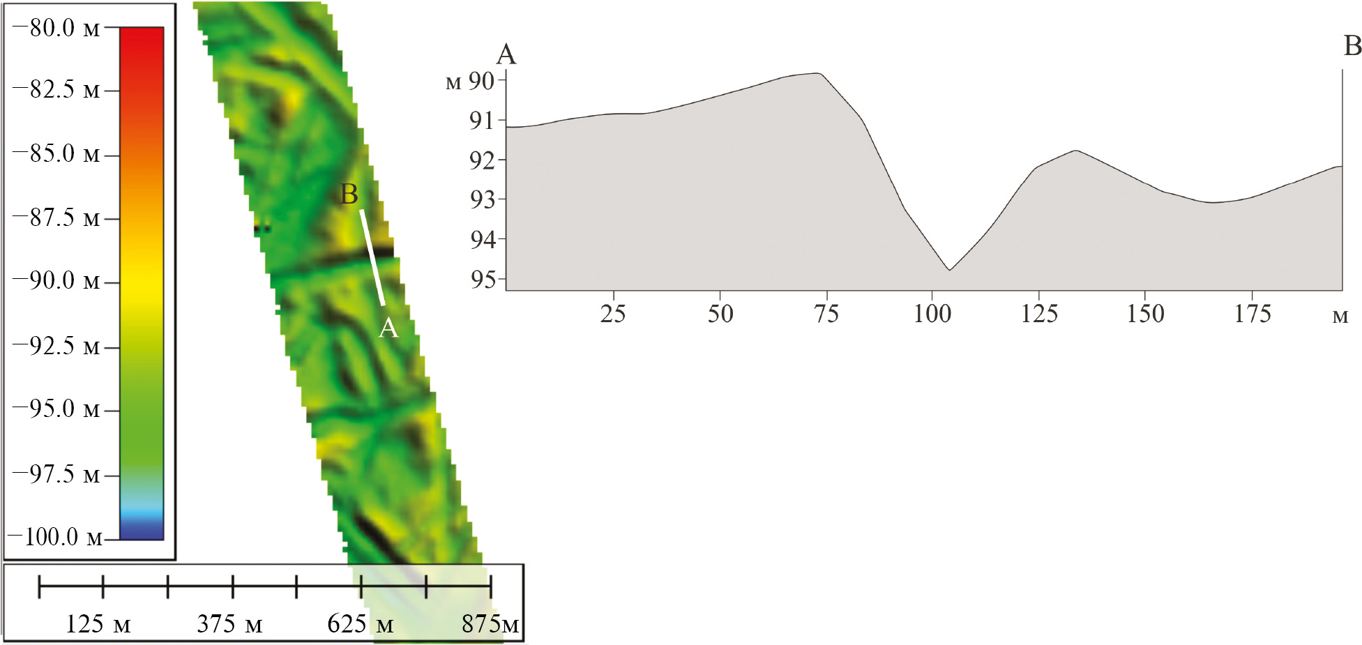 Рис. 6. Плановый вид и поперечный профиль через V-образную борозду к востоку от среднего Ямала (участок 9, положение см. на рис. 1).