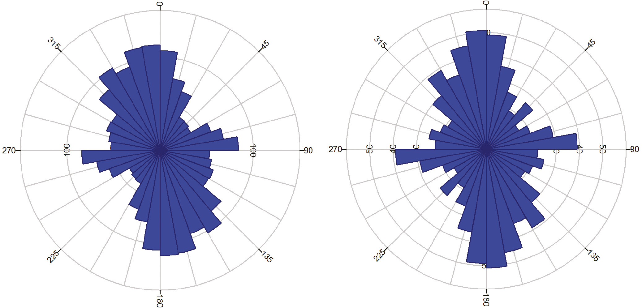 Рис. 8. Направления борозд выпахивания: слева – все борозды, справа – крупные борозды.