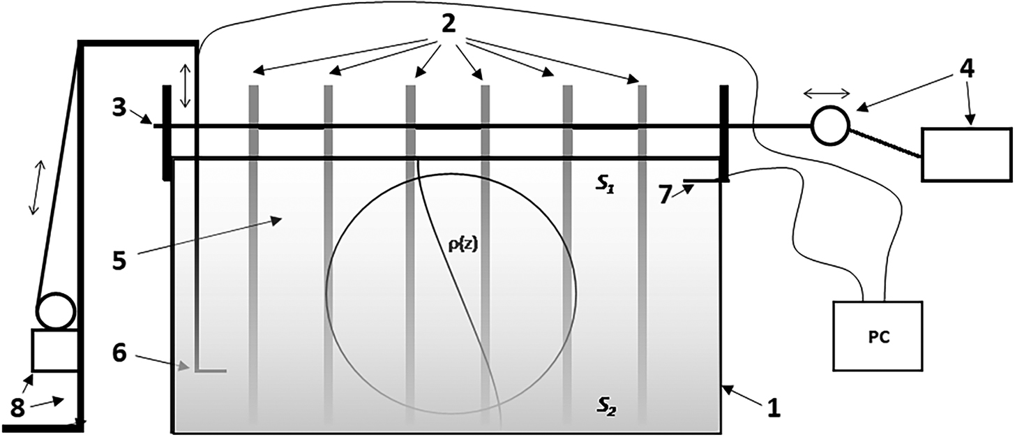 Рис. 1. Схема экспериментальной установки. 1 – бассейн из оргстекла с внутренним размером 36 × 13.5 × 25 см3; 2 – система решеток с вертикальными стержнями; 3 – шток, на котором закреплены решетки со стержнями; 4 – электродвигатель с эксцентриком, обеспечивающим горизонтальное колебание штока; 5 – линейно стратифицированная по солености водная среда; 6 – микродатчик электропроводности для измерения профиля солености; 7 – датчик электропроводности “Эксперт 002” в верхнем квазиоднородном слое; 8 – вертикальный лифт с электромотором для перемещения микродатчика электропроводности; PC – персональный компьютер для сбора измеряемых данных; S1 – соленость верхнего слоя, ρ(z) = β d S/dz – вертикальный градиент плотности, β – коэффициент соленостного сжатия. Круг в центре бака соответствует очертаниям плоскопараллельного пучка света, создаваемого теневым прибором.