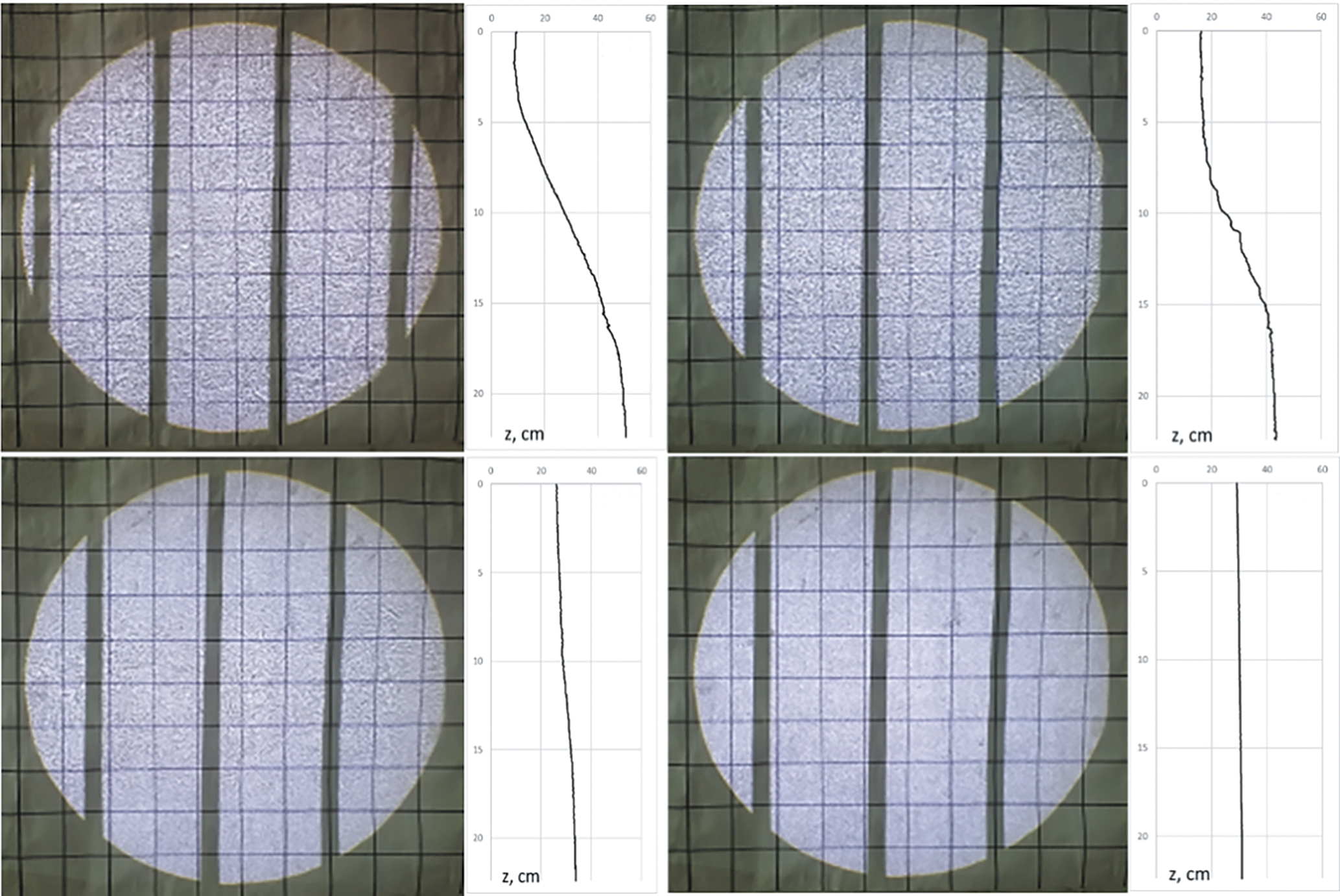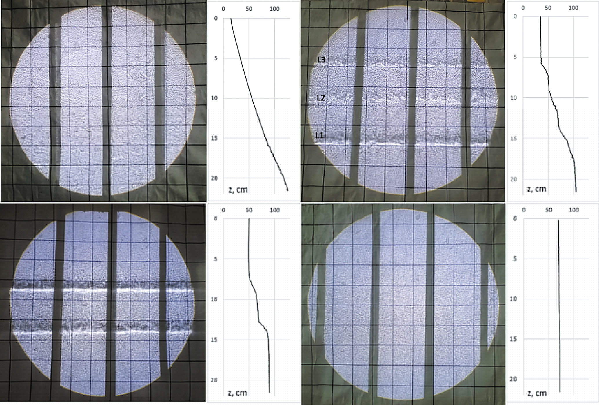 Всего было проведено четыре серии опытов с различным набором значений параметров (каждая серия состояла из нескольких одинаковых опытов). В первой серии начальный перепад солености составлял ΔS0 = 115 ppm, амплитуда колебаний стержней A = 1.2 см, период колебаний T = 2.5 с (Ri0 = 13, Re = 115). Во втором ΔS0 = 86 ppm, A = 1.2 см, T = 2.5 с (Ri0 = 9, Re = 115). В третьем ΔS0 = 65 ppm, A = 1.2 см, T = 3 (Ri0 = 11, Re = 96). В четвертом ΔS0 = 41 ppm, A = 1.2 см, T = 3 с (Ri0 = 5, Re = 96).