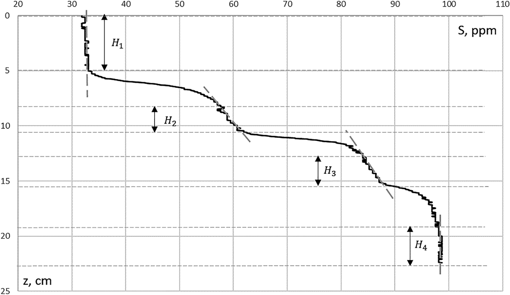 В первых трех сериях опытов, раньше или позже, происходило формирование ступенчатой структуры, в четвертой серии опытов стратификация оставалась квазилинейной от начала процесса перемешивания до его окончания. При этом во всех опытах наблюдалось образование верхнего и нижнего перемешанных слоев вне зависимости от того, расслаивалась ли вся толща изначально линейно стратифицированной жидкости или нет. Появление этих квазиоднородных слоев связано с тем, что потоки соли как через верхнюю свободную поверхность жидкости, так и через твердое дно бассейна равны нулю. Для того чтобы обеспечить выполнение этого условия, градиент солености в водном слое вблизи поверхности и дна должен быть равен нулю, что достигается путем образования приповерхностного и придонного перемешанных слоев. Измеряя изменение солености в каждом из этих слоев во времени, а также положение соленостных границ раздела между этим слоями и нижележащим/вышележащим (соответственно) стратифицированным водным слоем, можно оценить вертикальный поток солености через весь стратифицированный водный слой, если считать, что он непрерывен по вертикали.