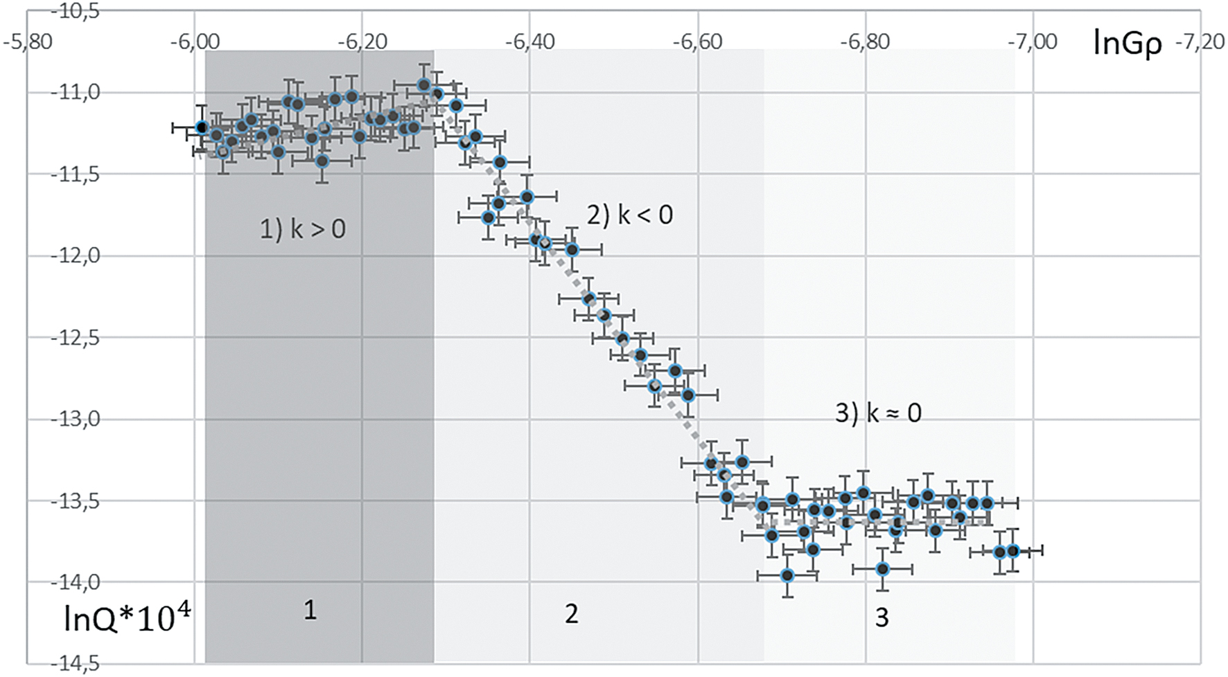 Рис. 5. Зависимость логарифма модуля потока массы Q от логарифма градиента плотности Gρ. Опыт с начальными значениями Ri0 = 13, Re = 115. Зоны, выделенные различными оттенками серого, соответствуют различному количеству высокоградиентных прослоек: 3, 2 и 1.