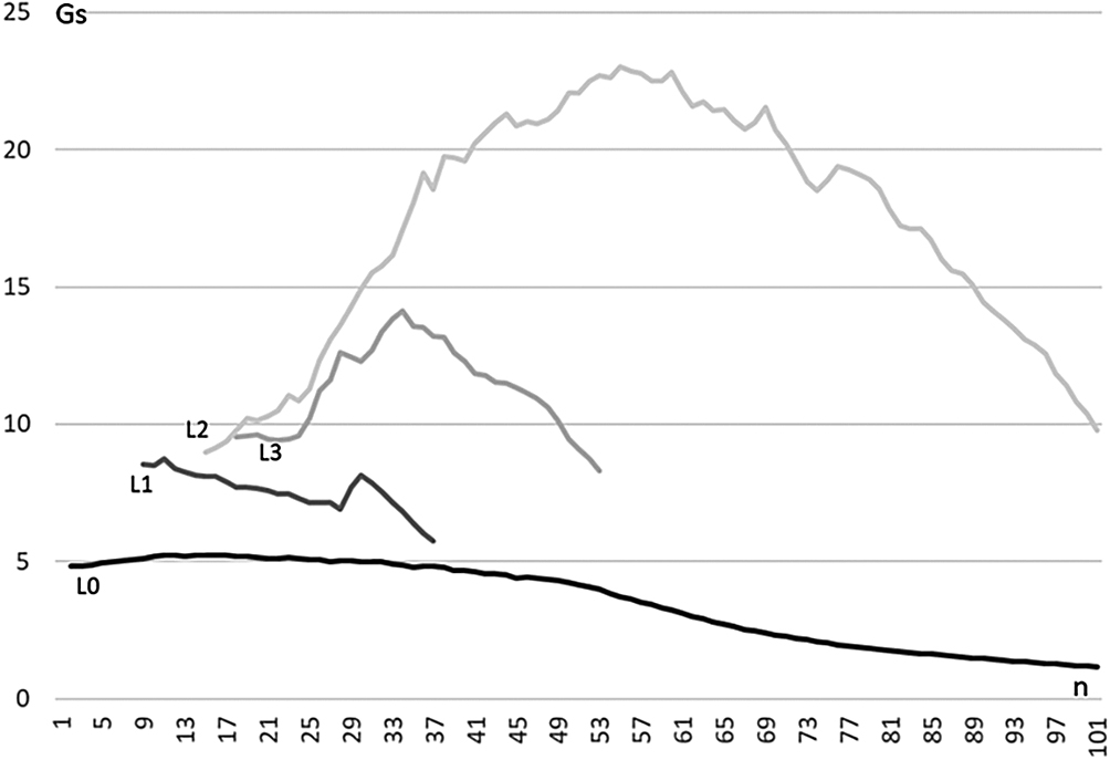 Рис. 6. Зависимость градиента плотности от времени (n – порядковый номер периода вертикального прохождения точечного датчика электропроводности) в последовательно образовывавшихся высокоградиентных слоях L1, L2, L3 и средний градиент плотности L0 между приповерхностным и придонным квазиоднородными слоями.