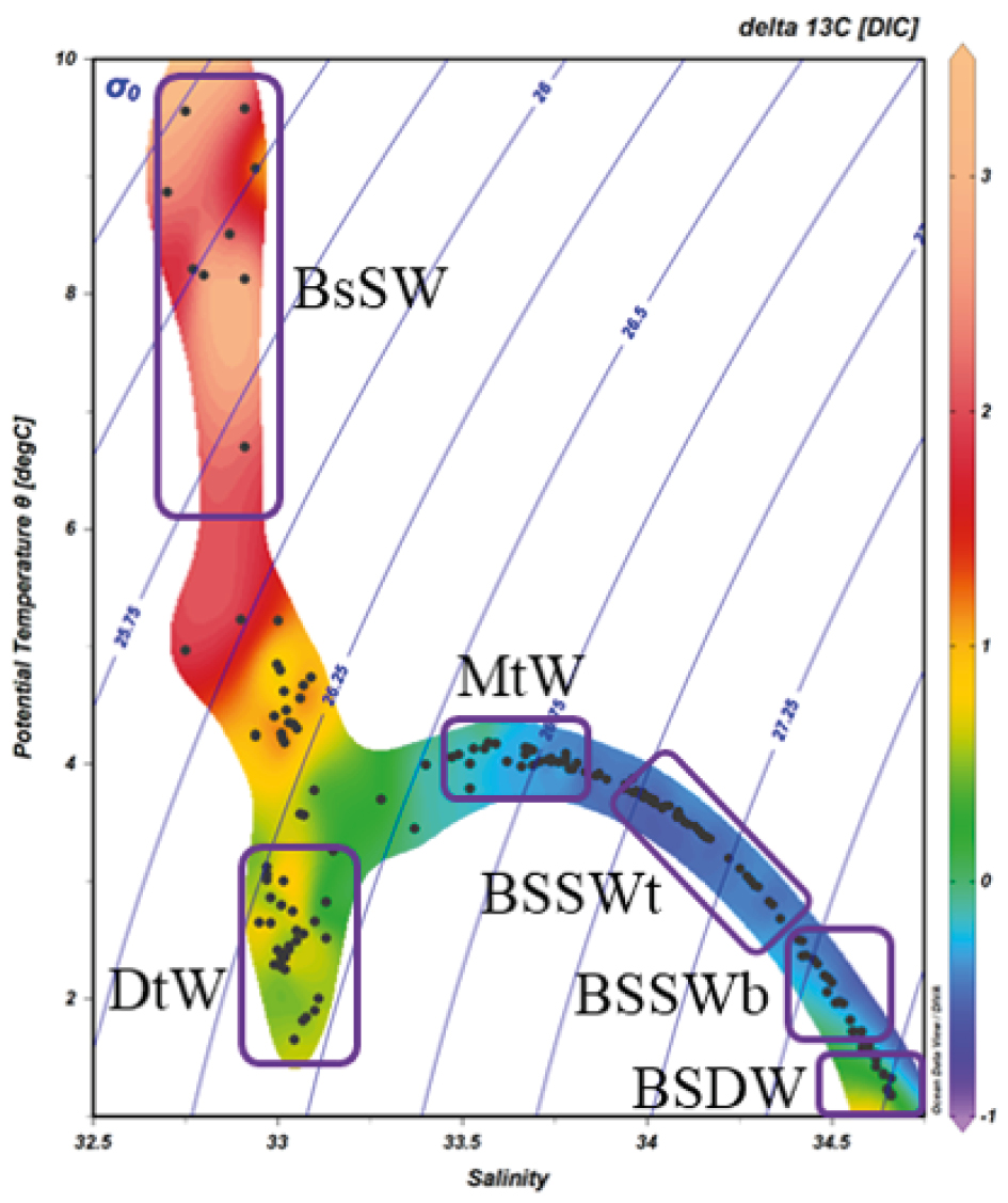Воды BSDW расположены на глубинах более 2800 м, имеют высокую условную плотность (σ0 = 27.75), постоянные потенциальную температуру (около 1.5°С), соленость (выше 34.6 епс) и крайне малые вариации величин δ18О и δD [2].