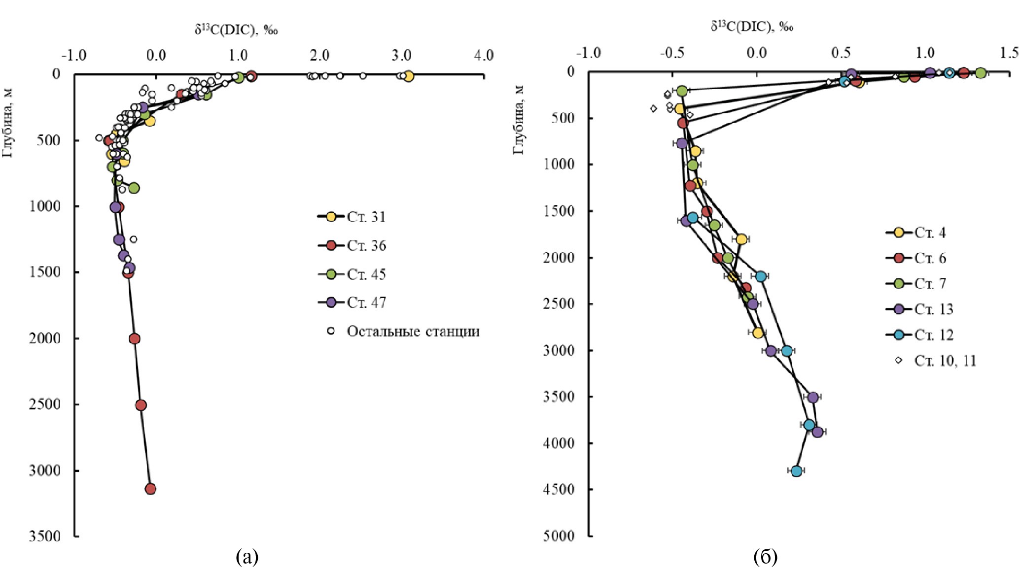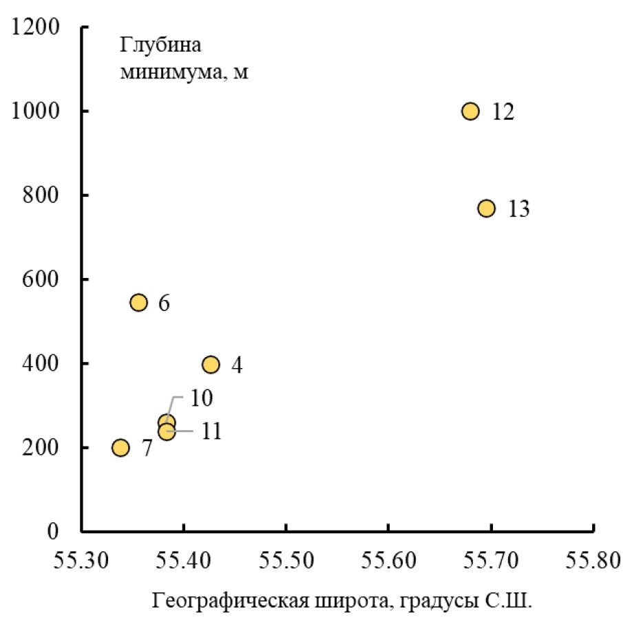 Для районов ПОЛ и КОМ наблюдается различие в положении и величине изотопно-углеродного минимума. В районе Корякского шельфа и континентального склона (ПОЛ) в водах всех станций, независимо от их расположения и глубины, прослеживается общая последовательность изменения δ13С(DIC), в которой минимум приходится на горизонт около 500 м (рис. 4а) даже на станциях, существенно удаленных от береговой линии (ст. 31, 36, 45, 47). Минимальные величины δ13С(DIC) варьируют от станции к станции от –0.32‰ до –0.7‰, и наименьшая из них (–0.7‰) наблюдается в зоне начала континентального склона (ст. 30) на глубине 481 м. Среднее значение минимума δ13С(DIC) составляет –0.48‰ по данным для 16 станций. В районе Командорских островов минимальные величины δ13С(DIC) варьируют слабо, от –0.38‰ до –0.46‰, для двух мелководных станций (10, 11) получены одинаковые значения минимума, равные –0.53‰. Однако, при стабильном значении δ13С(DIC)-минимума, для этого района наблюдается различие в глубине его расположения (рис. 4б), связанное с географической широтой. При отсутствии надежной статистики (всего 7 станций) трудно говорить о корректном тренде, но тенденция очевидна (рис. 5): при движении с юга на север вдоль меридиана 167.127–167.421° в.д. положение изотопного минимума углерода DIC становится более глубоким.