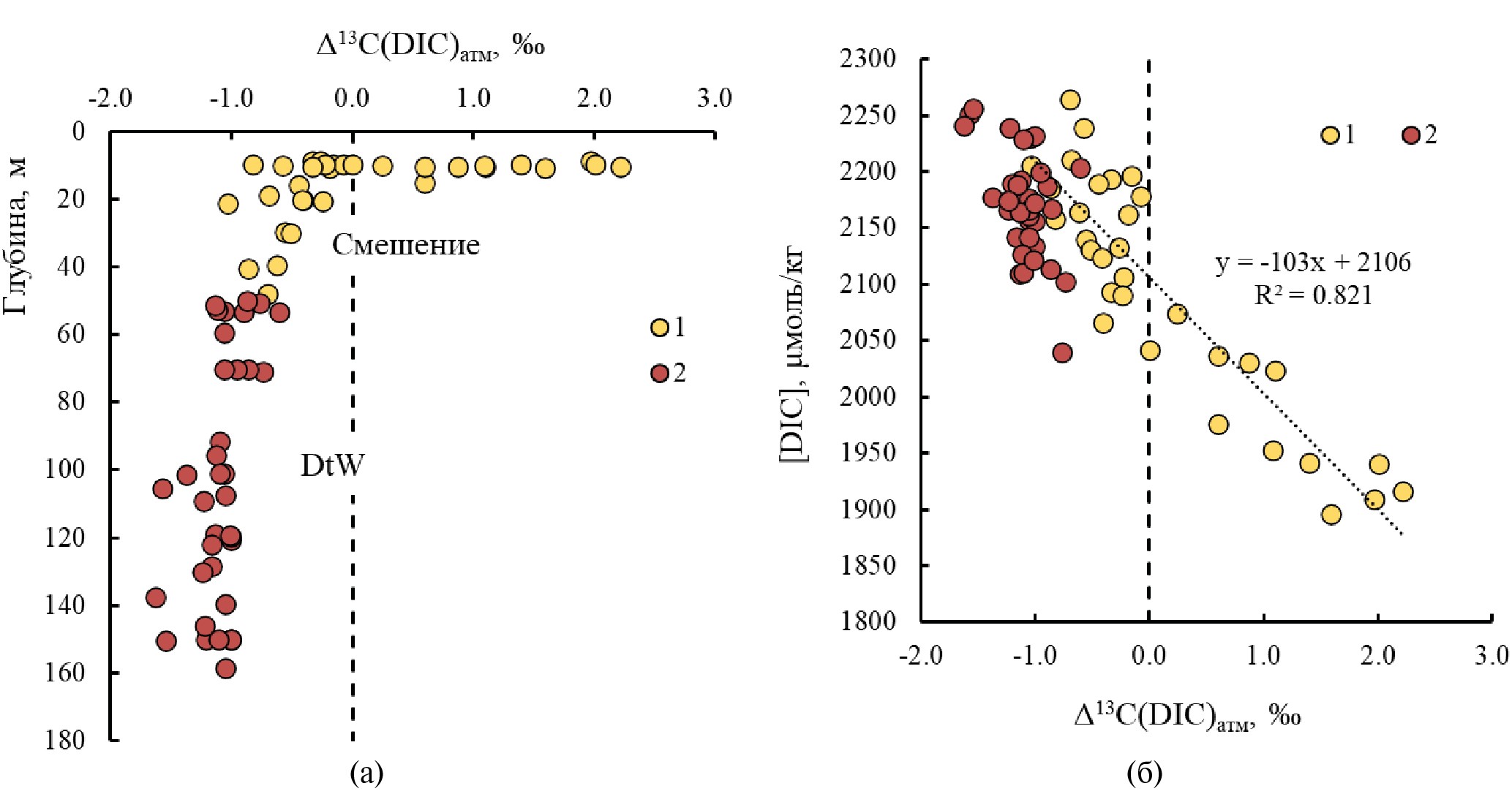 Для расчетов мы приняли в качестве нулевой точки составы, отвечающие равновесию с СО2 современной атмосферы, считая, что ПП и окисление ОВ оказывают влияние на величину δ13С(DIC), отклоняя ее от равновесия с СО2 атмосферы в ту или иную сторону. В этом случае изотопный и концентрационный сдвиг DIC относительно этой точки определяется соотношением интенсивности процессов ПП и окисления ОВ. В литературе часто используют обратный подход, в котором “биологический” фактор учитывается по концентрации фосфат-иона, чтобы выявить степень отклонения наблюдаемых величин от равновесия с СО2 атмосферы [10, 11, 23, 37, 45].