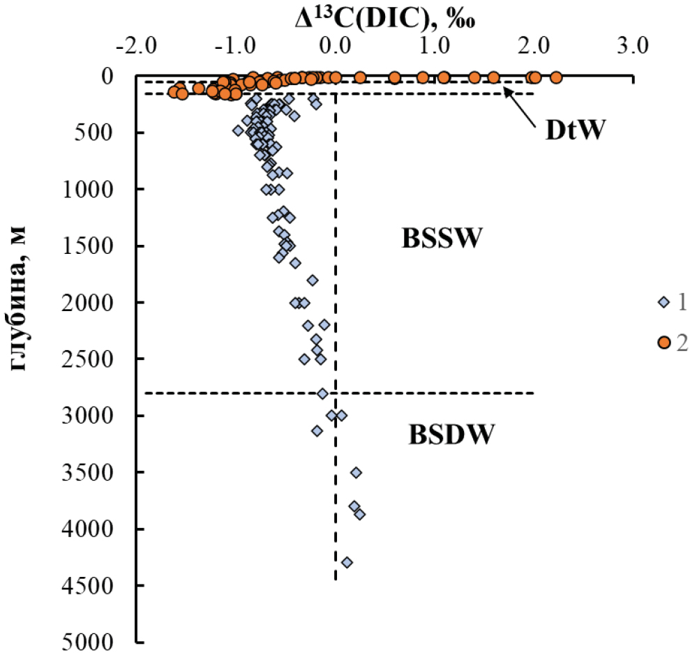 Видно, что наибольшее отрицательное отклонение от физических процессов наблюдается в пределах слоя дихотермальных вод, и это отклонение превышает величину изотопного минимума в районе глубины ≈ 500 м. По-видимому, изотопный сдвиг углерода, проявленный в дихотермальных водах, обусловлен не только окислением ОВ, но и дополнительным физическим фактором, кроме изотопного уравновешивания с СО2 атмосферы.
