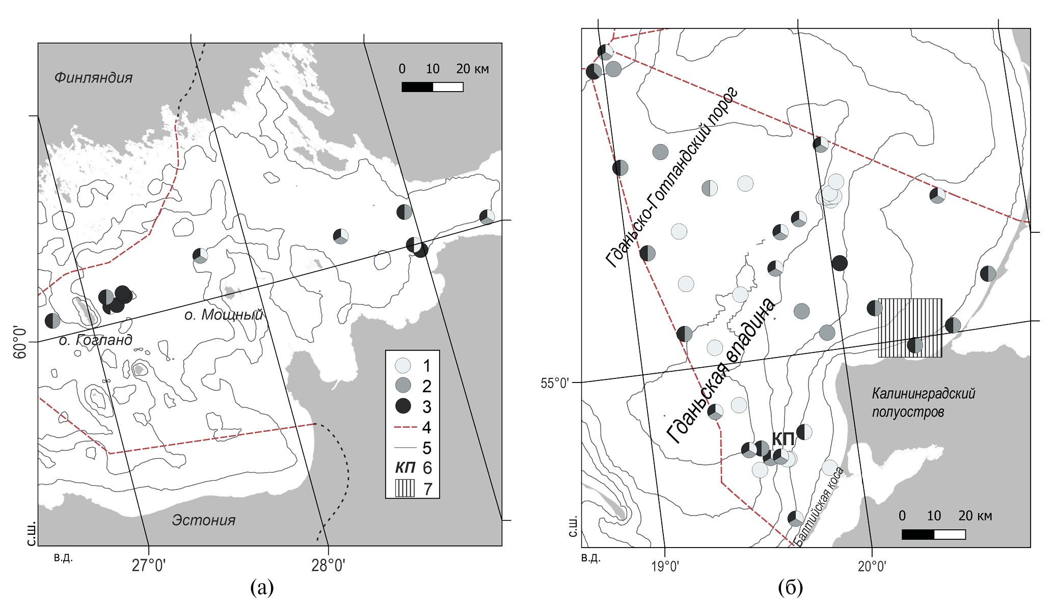 Рис. 1. Районы работ (а – Финский залив, б – Юго-Восточная Балтика) и расположение станций в рейсах: 1 – АСВ-55, 2 – АБП-54, 3 – АБП-55, 4 – границы российских секторов Балтийского моря, 5 – изобаты через 20 м, 6 – площадка карбонового полигона, 7 – литологический полигон.
