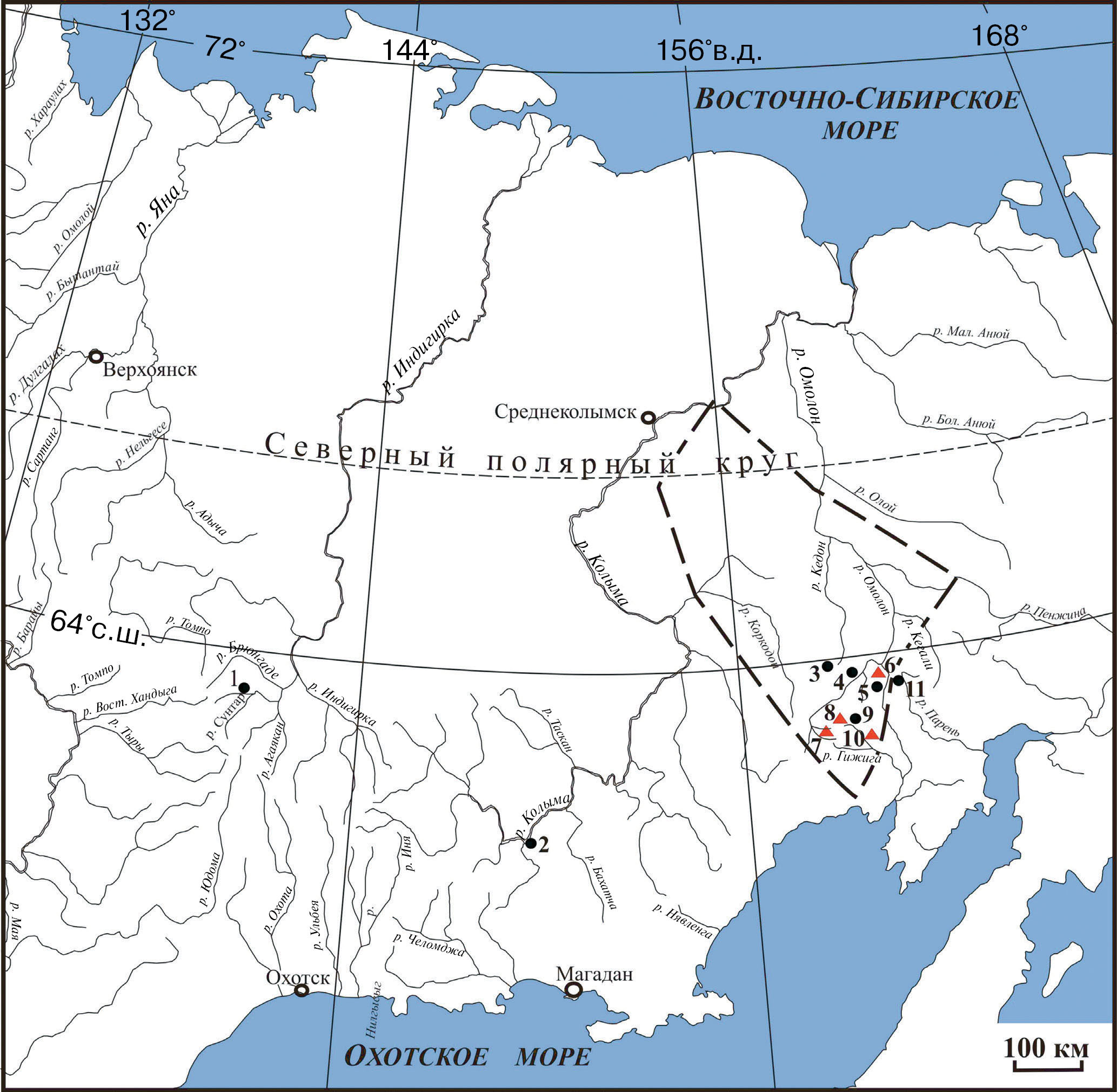 Рис. 1. Местонахождения представителей родов авикулопектиноидей Voluceropecten gen. nov. (кружки) и Vnigripecten Muromzeva (треугольники) на Северо-Востоке России: 1 – Южное Верхоянье, р. Кобюме, левый приток р. Сунтар (верхнее течение р. Индигирка); 2 – Аян-Юряхский антиклинорий, р. Колыма ниже устья р. Детрин; 3–10 – Омолонский массив и его юго-восточное обрамление: 3 – р. Астрономическая, приток р. Левый Кедон, 4 – р. Русская-Омолонская, 5 – верховья р. Худяна, приток р. Большая Ауланджа, 6 – левобережье нижнего течения р. Ледяная, приток р. Синяя (междуречье Большая и Малая Ауланджа), 7 – руч. Крутой, верховья р. Верхний Коаргычан, 8 – междуречье Ирбычан–Коргычан, 9 – руч. Левый и Правый Водопадный, верхнее течение р. Хивач, басс. р. Гижига, 10 – руч. Крутой, приток р. Хивач; 11 – руч. Чистый (Федоровский), приток р. Парень. Пунктиром показан контур Омолонского массива.