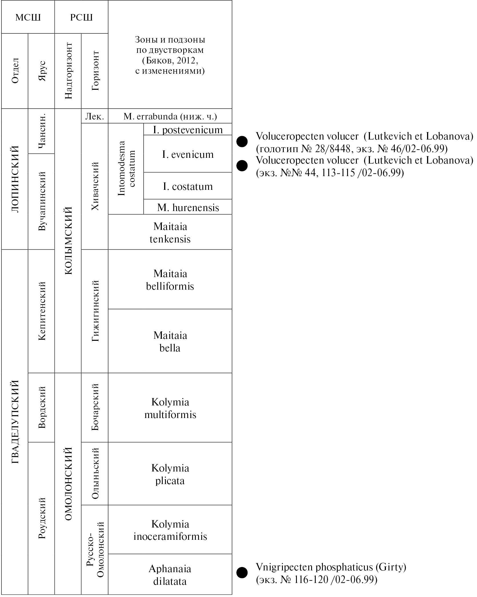 Рис. 2. Стратиграфическое положение находок представителей родов авикулопектиноидей Voluceropecten gen. nov. и Vnigripecten Muromzeva на Северо-Востоке России. Сокращения: Лек. – Лекеерский, МСШ – Международная стратиграфическая шкала, ниж. ч. – нижняя часть, РСШ – Региональная стратиграфическая шкала.