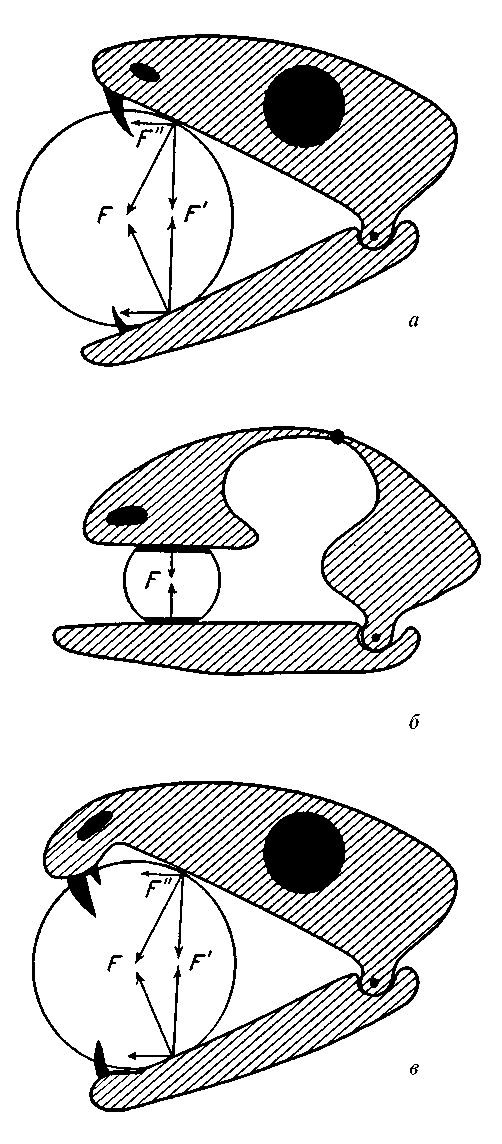 Рис. 2. Схемы распределения сил в момент сжимания добычи: а — при акинетической и метакинетической конструкции черепа, б — при мезокинетической конструкции черепа, в — при акинетической и метакинетической конструкции черепа, но при анизодонтности, клювообразном изгибе предчелюстной кости и фестончатости альвеолярного края челюстей, обеспечивающих удержание добычи в пасти. F — общая сила давления челюстей, F1 — сила, сжимающая удерживаемый объект, F2 — сила, выталкивающая объект из пасти (по: Юдин, 1970, с дополнениями).