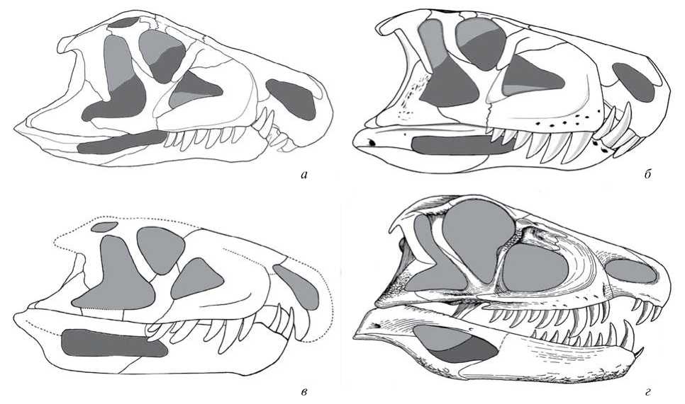 Рис. 3. Черепа орнитозухид, вид с латеральной стороны (справа): а — Riojasuchus tenuisceps (по: Baczko, Desojo, 2016); б — Dynamosuchus collisensis (по: Müller et al., 2020); в —Venaticosuchus rusconii (по: Baczko, 2018); г — Ornithosuchus longidens (по: Walker, 1964).