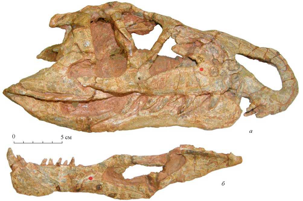 Рис. 4. Riojasuchus tenuisceps, Музей естественной истории Фонда Мигэля Лилло, экз. № PVL 3827: а — череп, вид с латеральной стороны (справа), б — левая ветвь нижней челюсти, вид с лабиальной стороны (слева). Фото А.Г. Сенникова.