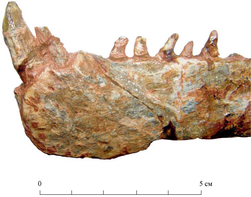 Рис. 7. Riojasuchus tenuisceps, Музей естественной истории Фонда Мигэля Лилло, № PVL 3827, ростральная часть левой зубной кости, вид слева. Фото А.Г. Сенникова.