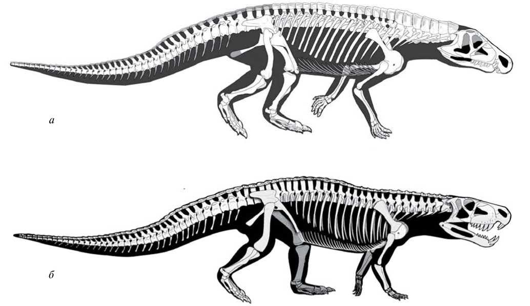 Рис. 9. Скелеты орнитозухид, вид справа: а — Riojasuchus tenuisceps (по: Baczko et al., 2019), б — Dynamosuchus collisensis (по: Müller et al., 2020).