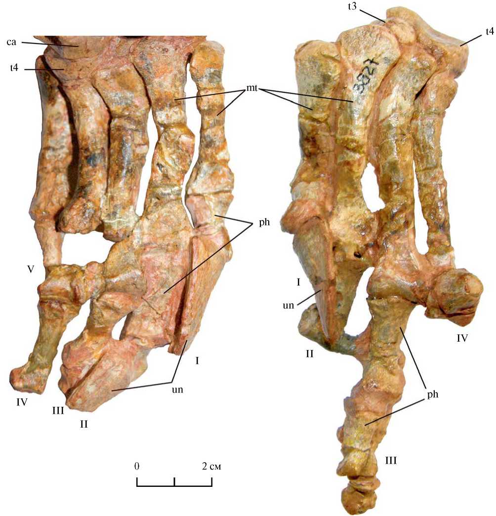 Рис. 11. Скелет правой (а) и левой (б) стопы орнитозухида Riojasuchus tenuisceps, Музей естественной истории Фонда Мигэля Лилло, экз. № PVL 3827, вид с дорсальной стороны: а — по Baczko et al., 2019, б — фото А.Г. Сенникова. Обозначения: ca — пяточная кость, t4 — четвертый дистальный тарсальный элемент, t3 — третий дистальный тарсальный элемент, mt — метатарсальные элементы, I–V — номера пальцев, ph — фаланги, un — когтевые фаланги.