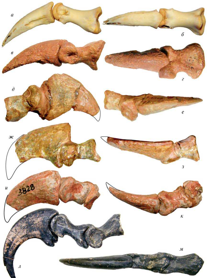 Рис. 12. Когтевые и предкогтевые фаланги: а, б — крокодил Tomistoma schlegelii, I палец правой стопы, Зоологический музей МГУ, экз. № R-9296: а — вид с медиальной стороны, б — вид с дорсальной стороны; в, г — эритрозухид Garjainia prima, I палец (?) правой стопы (изолированные фаланги), экз. ПИН, №№ 951/21 и 951/98: в – вид с медиальной стороны, г — вид с дорсальной стороны; д–к — орнитозухид Riojasuchus tenuisceps: д, е — I палец левой стопы, Музей естественной истории Фонда Мигэля Лилло, экз. № PVL 3827: д — вид с медиальной стороны, е — вид с дорсальной стороны; ж, з — I палец правой стопы, Музей естественной истории Фонда Мигэля Лилло, экз. № PVL 3827: ж — вид с медиальной стороны, з — вид с дорсальной стороны; и, к — II палец (?) правой стопы, Музей естественной истории Фонда Мигэля Лилло, экз. № PVL 3828: и – вид медиальной стороны, к – вид с дорсальной стороны; л, м – дромеозаврид Deinonychus antirrhopus, II палец правой стопы, экз. ПИН, № 4769/16: л — вид медиальной стороны, м — вид с дорсальной стороны. а–з, л, м — фото А.Г. Сенникова; и, к — по: Baczko et al., 2019.