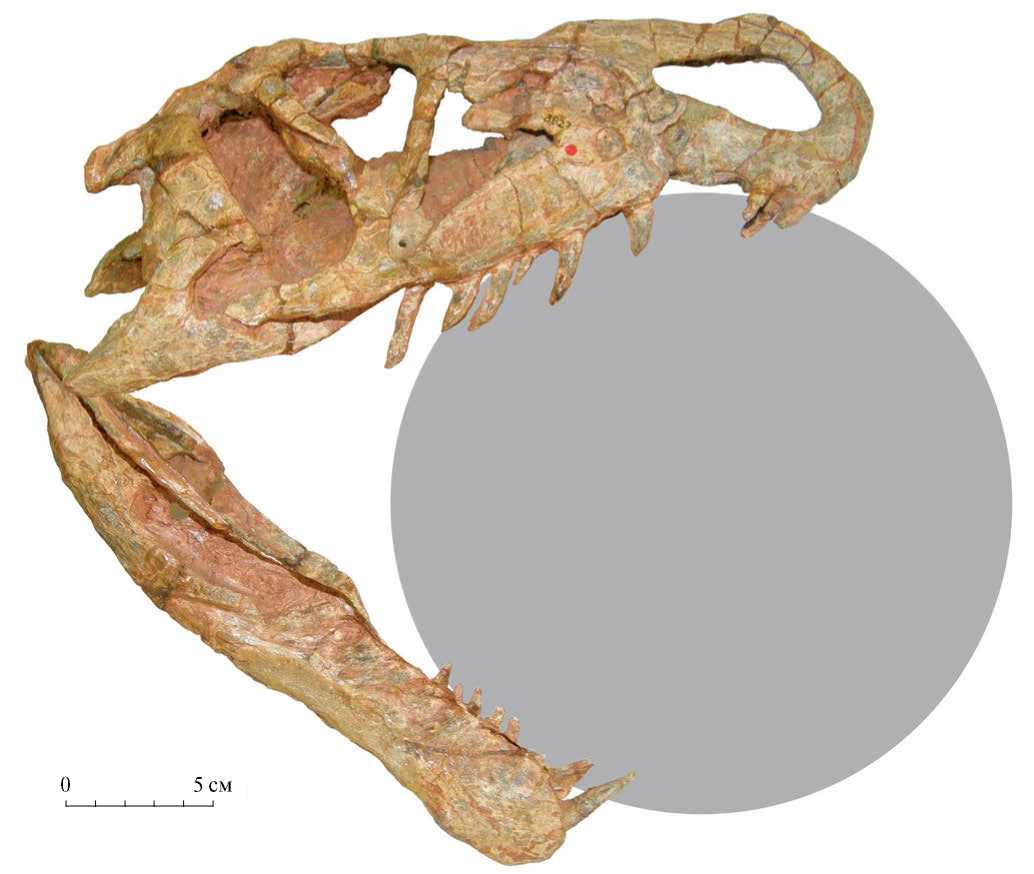Рис. 13. Riojasuchus tenuisceps, Музей естественной истории Фонда Мигэля Лилло, экз. № PVL 3827, реконструкция черепа с максимально открытой пастью при захвате добычи (по аналогии с современными крокодилами), вид справа. По фото А.Г. Сенникова.