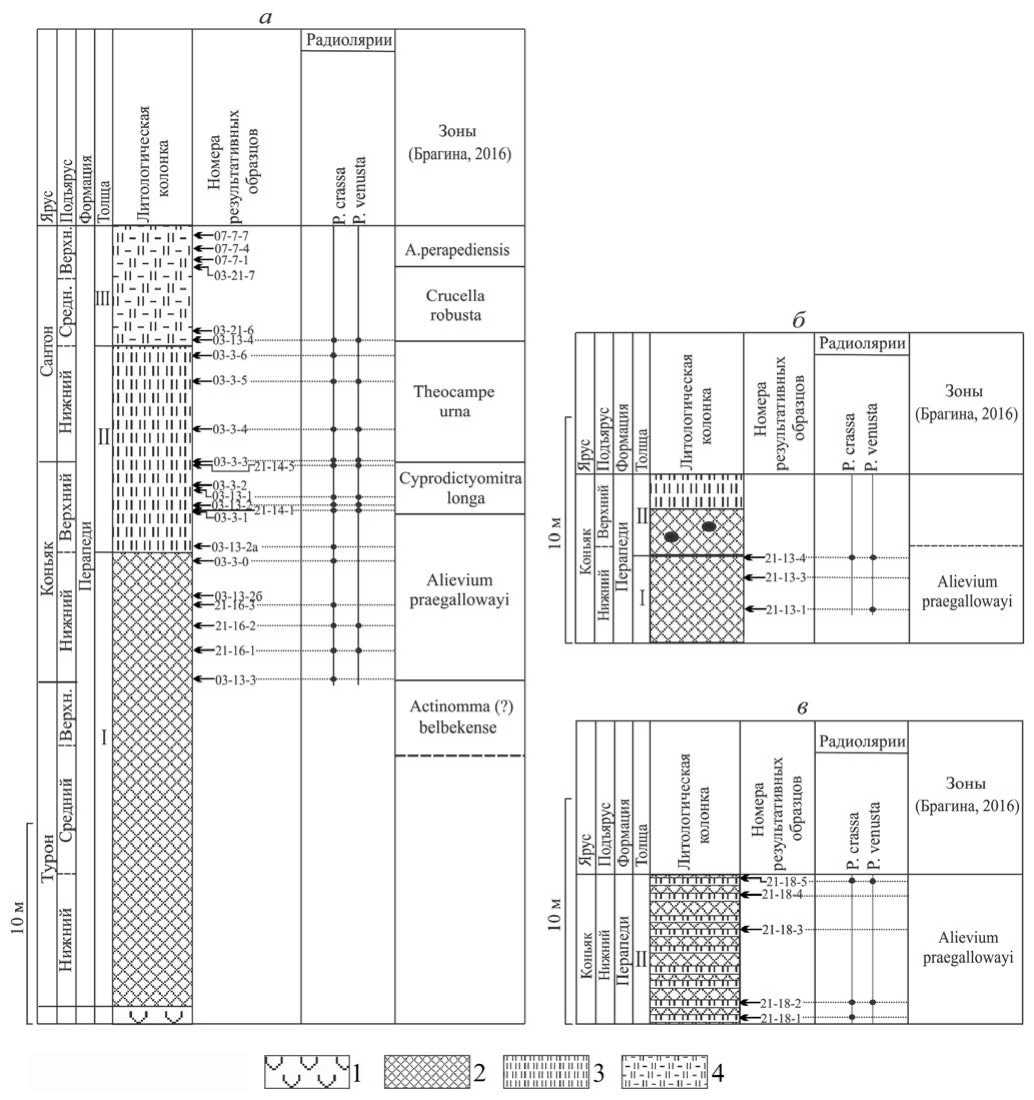 Рис. 2. Литологические колонки: а – композитный разрез Мангалени, б – разрез Мангалени-4, в – разрез Мангалени-8. Обозначения: 1 – верхние пиллоу-лавы, 2 – умбриты с прослоями радиоляриевых кремней и массивных абиогенных кремней, 3 – кремни с прослоями кремнистых аргиллитов, 4 – кремни опоковидные, марганцовистые.
