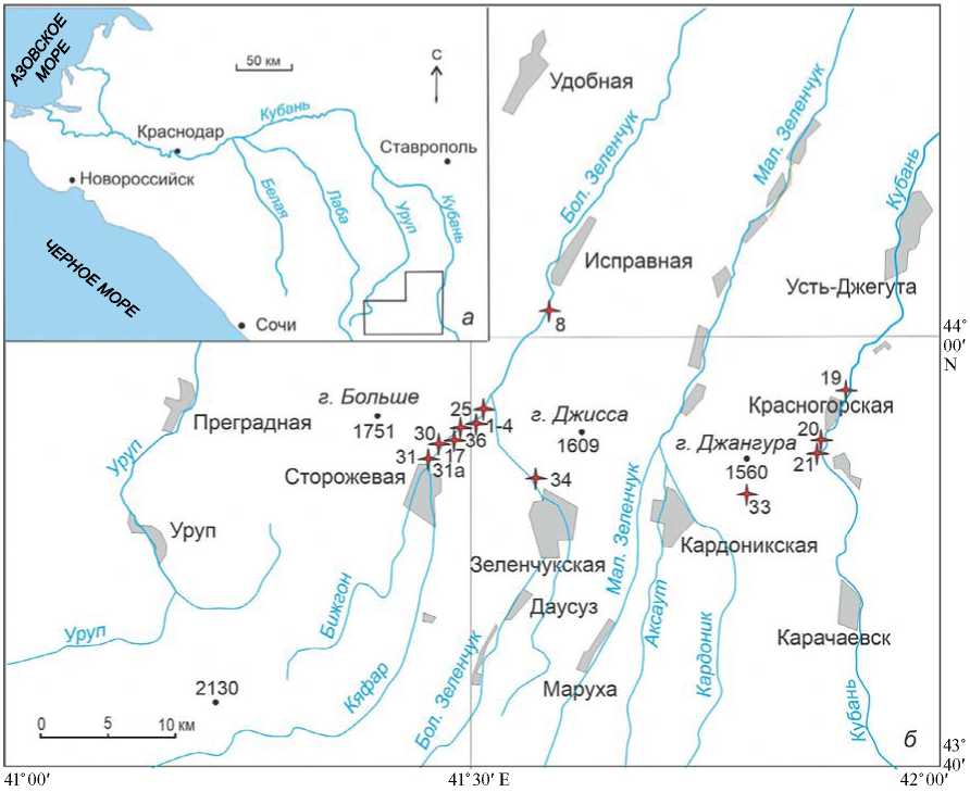 В течение последнего десятилетия автором проводится системная работа по изучению аммонитов и биостратиграфии верхов байоса – низов бата бассейна Кубани (верхняя подсвита джангурской свиты: Безносов, 1967), преимущественно в пределах Зеленчукского и Усть-Джегутинского р-нов Карачаево-Черкесской республики (рис. 1). За 16 полевых поездок, начиная с 2014 г., при существенной поддержке друзей и коллег собран большой палеонтологический материал, результаты изучения которого представлены в ряде публикаций, в т.ч. посвященных описанию перисфинктоидей.