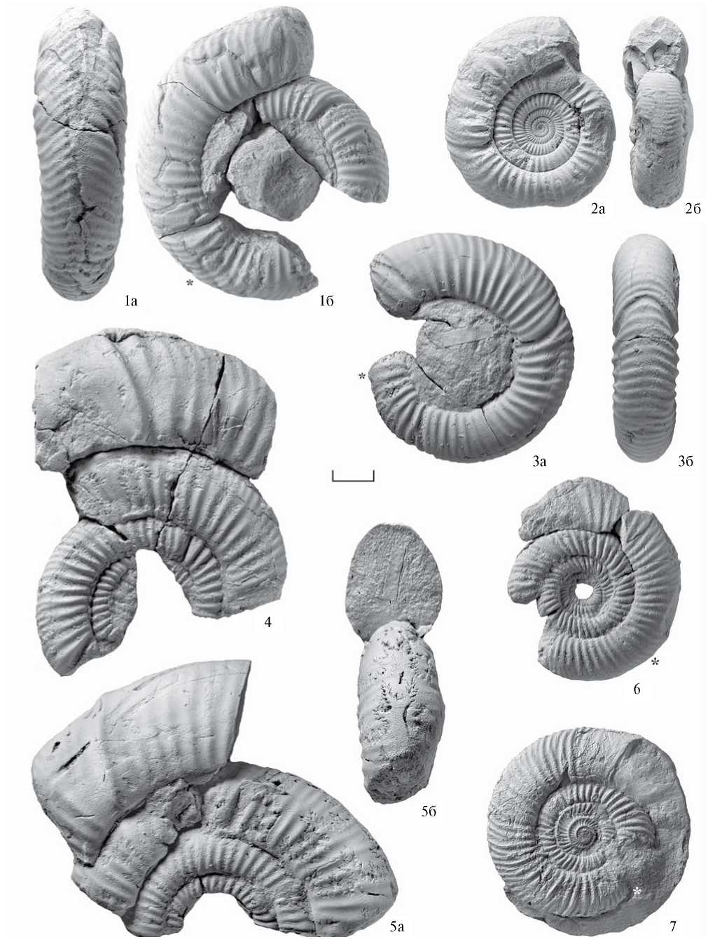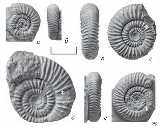 Рис. 2. Infragarantiana primitiva (Wetzel): а, б – экз. ПИН, № 5546/378: а – сбоку, б – с вентральной стороны; в, г – экз. ПИН, № 5546/376: в – с вентральной стороны, г – сбоку; д – задняя часть жилой камеры со слепком внутренних оборотов, экз. ПИН, № 5546/377, сбоку; е, ж – экз. ПИН, № 5546/375: е – с вентральной стороны, ж – сбоку; Карачаево-Черкесия, Зеленчукский р-н, лев. берег р. Кяфар ниже устья р. Бижгон, местонахождение № 31а; из переотложенных конкреций нижнего байоса; сб. автора, 2022 г. Масштабная линейка 10 мм; звездочкой (*) отмечено начало жилой камеры.
