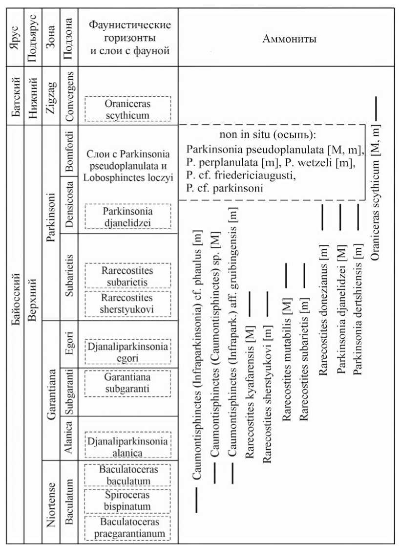 Эволюционная линия паркинсониид в бассейне Кубани завершается родом Oraniceras – вид O. scythicum Mitta [M, m] был описан из подошвы батского яруса р. Бол. Зеленчук выше ст. Исправная (местонахождение 8) (Митта, 2015; Митта и др., 2017).