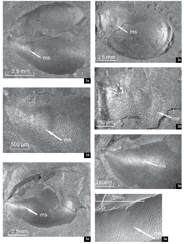 Фиг. 1–3. Sinskolutellа ordinatа (Melnikova, 1983): 1 – экз. ПИН, № 4349/571, две створки на поверхности породы: 1а – общий вид, 1б – увеличенный фрагмент створки с мускульным пятном; 2 – экз. ПИН, № 4349/595, LV сбоку: 2а – общий вид, 2б – увеличенный фрагмент створки с мускульным пятном; 3 – экз. ПИН, № 4349/572, LV неполной сохранности сбоку: 3а – общий вид, 3б, 3в – увеличенный фрагмент створки с мускульным пятном с разным увеличением; Республика Саха (Якутия), Сибирская платформа, местонахождение “Синское”, среднее течение р. Лена, правый берег, в 2.5 км от устья ручьев Аччагый-Туойдах и Улахан-Туойдах; нижний кембрий, ботомский ярус, синская свита, зона gurarii. Обозначения: LV – левая створка, ms – след прикрепления мускула-аддуктора.