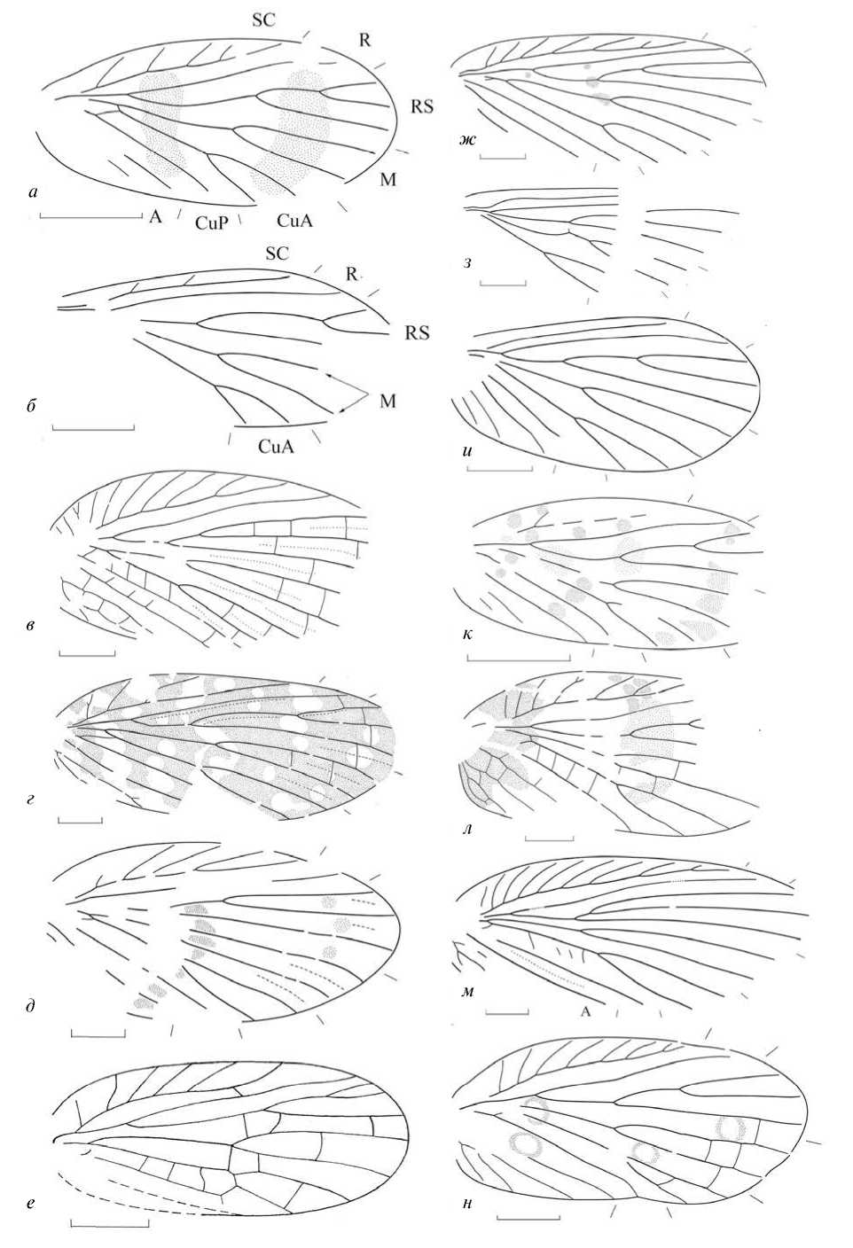 Рис. 1. Виды рода Permosialis Martynov, передние крылья (если не сказано иначе): а, б – P. paucinervis Martynov, 1928: а – переднее крыло, экз. ПИН, № 94/798 (голотип P. cauleoides O. Martynova, 1952), б – заднее крыло, экз. ПИН, № 117/1756 (голотип P. brevifurcata O. Martynova, 1952); в – P. asiatica O. Martynova, 1961, экз. ПИН, № 966/16 (голотип P. sibirica O. Martynova, 1961); г – P. bayda Aristov et Rasnitsyn, 2022, голотип ПИН, № 3701/2; д – P. belebei Aristov et Rasnitsyn, 2022, голотип ПИН, № 1366/379; е – P. belmontensis Riek, 1968, голотип F-40700; ж, з – P. frivola (Storozhenko, 1991), экз. ПИН, № 2781/241: ж – переднее крыло, з – заднее крыло; и – P. latiformis O. Martynova, 1952, голотип ПИН, № 117/1153, заднее крыло; к – P. martynovae Aristov et Rasnitsyn, 2023, голотип ПИН, № 3353/811; л – P. matutina O. Martynova, 1961, экз. ПИН, № 1197/412; м – P. mongolica (Storozhenko, 1992), голотип ПИН, № 4305/286; н – P. perfecta Martynova, 1952, голотип ПИН, № 117/1772. Длина масштабной линейки соответствует 3 мм.