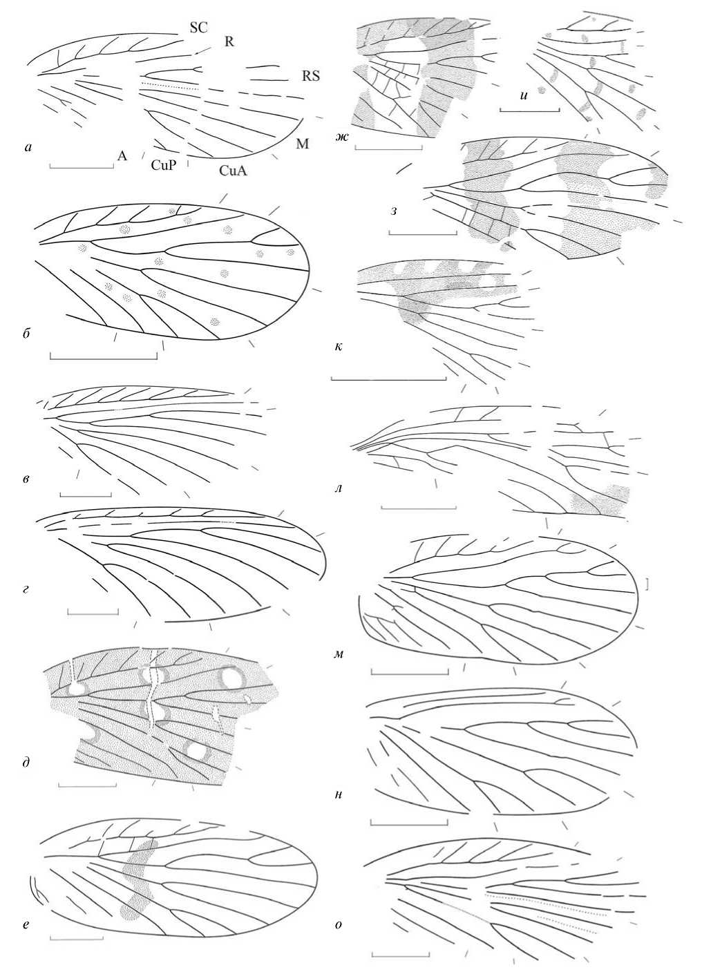 Рис. 2. Виды родов Permosialis Martynov (а–и), Balymotikha Rasnitsyn et Aristov (к), Onthomastax Rasnitsyn et Aristov (л) и Palaeomantopsis Martynov (м–о), передние крылья (если не указано иначе): а – P. postuma Aristov et Rasnitsyn, 2023, голотип ПИН, № 4305/321; б – P. punctimaculosa Novokshonov et Rasnitsyn, 2001, паратип ПИН, № 4987/57; в, г – P. triassica Novokshonov et Zhuzhgova, 2004: в – переднее крыло, голотип ПИН, № 2555/2066, г – заднее крыло, экз. ПИН, № 2555/743; д – P. ualentovae Novokshonov et Zhuzhgova, 2004, голотип ПИН, № 1366/349; е – P. udmurtensis Rasnitsyn et Aristov, 2013, экз. ПИН, № 3286/283; ж – P. virgata Aristov et Rasnitsyn, 2023, голотип ПИН, № 4305/279; з – P. vizzya Aristov et Rasnitsyn, 2023, голотип ПИН, № 1631/503; и – P. zavialovensis Rasnitsyn et Aristov, 2013, голотип ПИН, № 3286/124; к – B. deterior Rasnitsyn et Aristov, 2013, голотип ПИН, № 5103/20; л – O. coprinus Rasnitsyn et Aristov, 2013, голотип ПИН, № 3286/146; м, н – P. furcatella Martynov, 1928: м – переднее крыло, экз. ПИН, № 3353/807, н – заднее крыло, экз. ПИН, № 117/1444 (2652), (голотип Permosialis quadriramosa O. Martynova, 1952); о – P. nana (Storozhenko, 1992), голотип ПИН, № 4305/319. Длина масштабной линейки соответствует 3 мм.