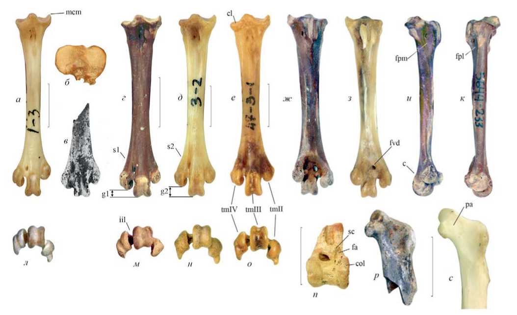 Рис. 1. Тарсометатарсусы (а–о), тибиотарсус (п) и коракоиды (р, с) Paralyra atavus (Janossy, 1974) из верхнего плиоцена – нижнего плейстоцена Восточной Европы в сравнении с избранными современными Tetraonini: а, л, с – Lagopus lagopus (L., 1758), экз. остеол. коллекции ПИН 47-4-3, современный; б–г, ж, и, к, м, п, р – Paralyra atavus: б, г, ж, и, к, м – экз. ПИН, № 5644/233, Крым, пещера Таврида; нижний плейстоцен; в – экз. б/н в колл. ISEZ (Jánossy, 1974), Польша, Рембелицы Крулевски 1; верхний плиоцен; п – экз. ПИН, № 5644/232, Крым, пещера Таврида; нижний плейстоцен; р – экз. ISEZ, № AF/16-RK1:12, Польша, Рембелицы Крулевски 1; верхний плиоцен; д, з, н – Lyrurus tetrix (L., 1758), экз. остеол. коллекции ПИН 47-8-2, современный; е, о – Dendragapus obscurus (Say, 1823), экз. остеол. коллекции ПИН 47-3-1, современный. а, в–е – с дорсальной стороны; б – с проксимальной стороны; ж, з – с плантарной стороны; и – с медиальной стороны; к – с латеральной стороны; л–о – с дистальной стороны; п – с краниальной стороны; р, с – с вентральной стороны. Обозначения: c – trochlea metatarsi III при виде с медиальной стороны выступает краниально; cl – cotyla lateralis; col – condylus lateralis; fa – площадка, отделяющая сухожильный шрам от condylus lateralis; fpl – fossa parahypotarsalis lateralis; fpm – fossa parahypotarsalis medialis; fvd – foramen vasculare distale; g1 – trochlea metatarsi IV сильно выдвинут дистально, приближен к trochlea metatarsi III; g2 – trochlea metatarsi IV слабо выдвинут дистально, удален от trochlea metatarsi III; iil – incisura intertrochlearis lateralis; mcm – медиальная кромка cotyla medialis; pa – processus acrocoracoideus; sc – сухожильный шрам (apophysis externum ligamenti obliqui); s1 – слабо оставленный латерально (постепенно расширяющийся) trochlea metatarsi IV у Paralyra atavus; s2 – резко (сильно) отставленный латерально trochlea metatarsi IV; tm II–IV – trochleae metatarsorum II–IV. Длина масштабной линейки 10 мм.