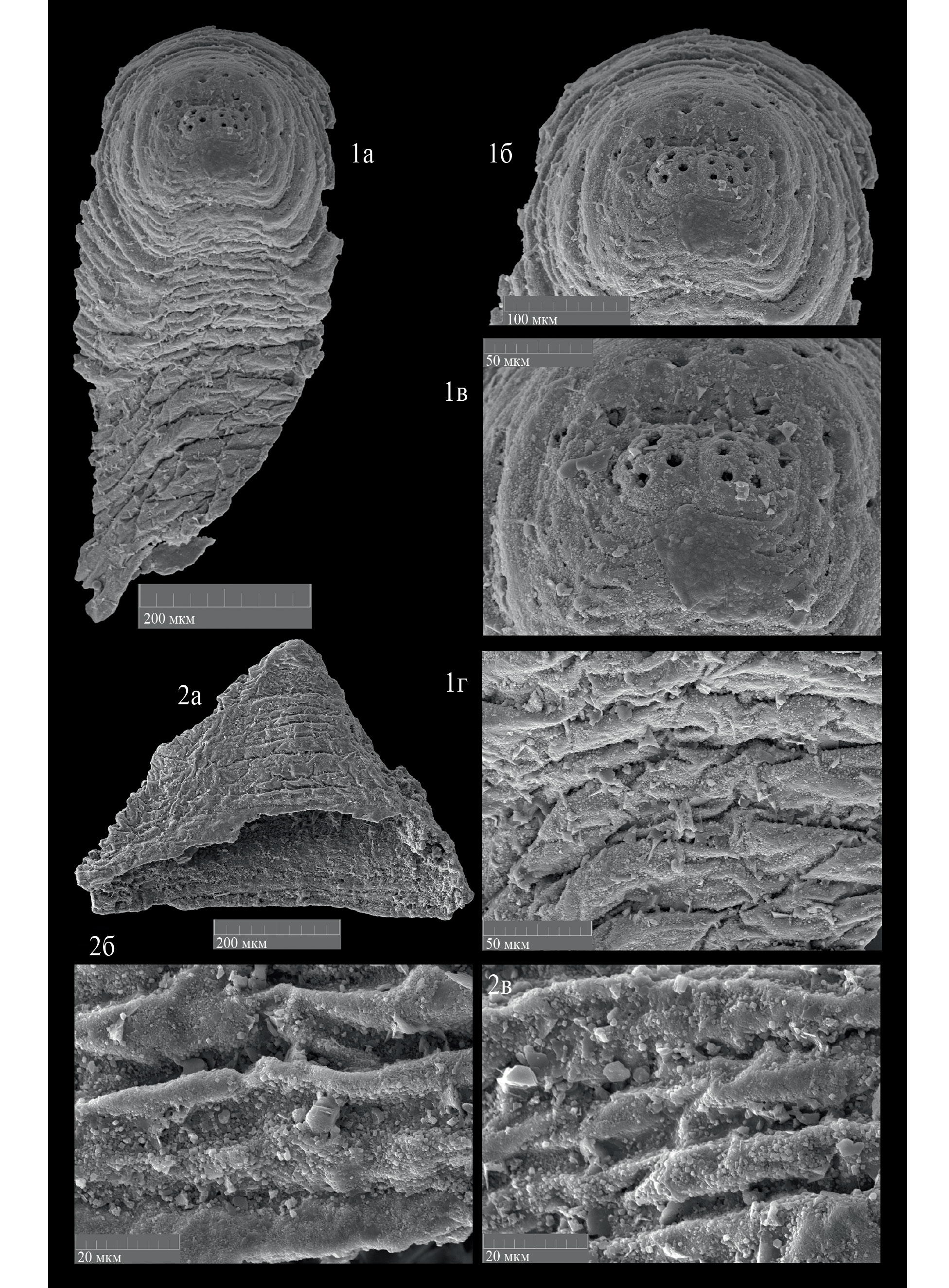 Фиг. 1, 2. Tannuolina pavlovi Kouchinsky, Bengtson et Murdock, 2010: 1 – экз. ПИН, № 5083/5187: 1а – общий вид обломанного уплощенного склерита; видна наружная поверхность с волнообразными ребрами; верхняя часть склерита (макушка) обломана по горизонтальной септе, на поверхности которой видны остатки от пористой сросшейся двойной макушки склерита; 1б, 1в – увеличенные фрагменты фиг. 1а, вид сверху обломанного по септе склерита со сросшейся двойной макушкой, на которой видны фрагменты складчатого пористого слоя; 1г – увеличенный фрагмент наружной поверхности склерита с выпуклыми волнообразными ребрами; 2 – экз. ПИН, № 5083/5121: 2а – общий вид уплощенного склерита; 2б, 2в – увеличенные фрагменты наружной поверхности склерита с выпуклыми волнообразными ребрами; Сибирская платформа, разрез по прав. берегу р. Сухая Тунгуска; томмотский ярус, костинская свита.
