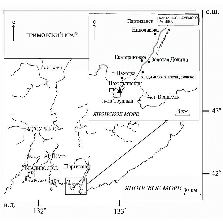 Рис 1. Схема расположения Находкинского рифа в Южном Приморье (по: Малышева, 2019б, с дополнениями).
