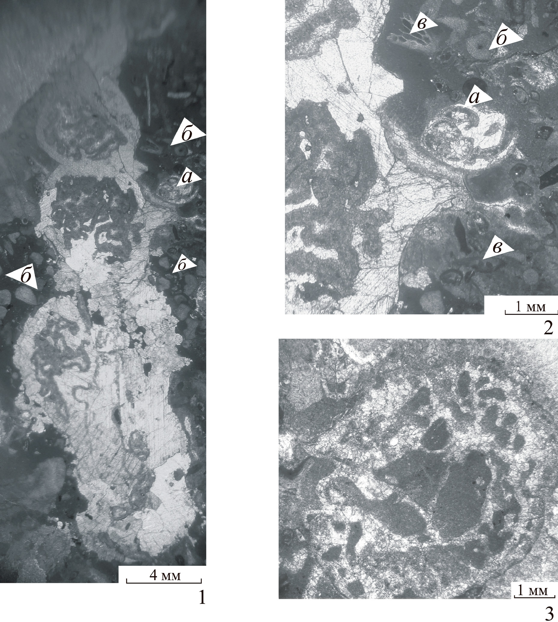 Фиг. 1–3. Paradeningeria magna sp. nov.: 1, 2 – голотип ДВГИ, № 6/26: 1 – продольный срез, фрагмент ветви; 2 – фрагмент боковой стенки камеры; 3 – экз. ДВГИ, № 6/27, поперечный срез, фрагмент ветви; Южное Приморье, Находкинский риф; средняя пермь, кепитенский ярус, зона Stacheoceras orientale. Стрелками показаны: а – фораминиферы, б – членики криноидей, в – фрагменты мшанок.