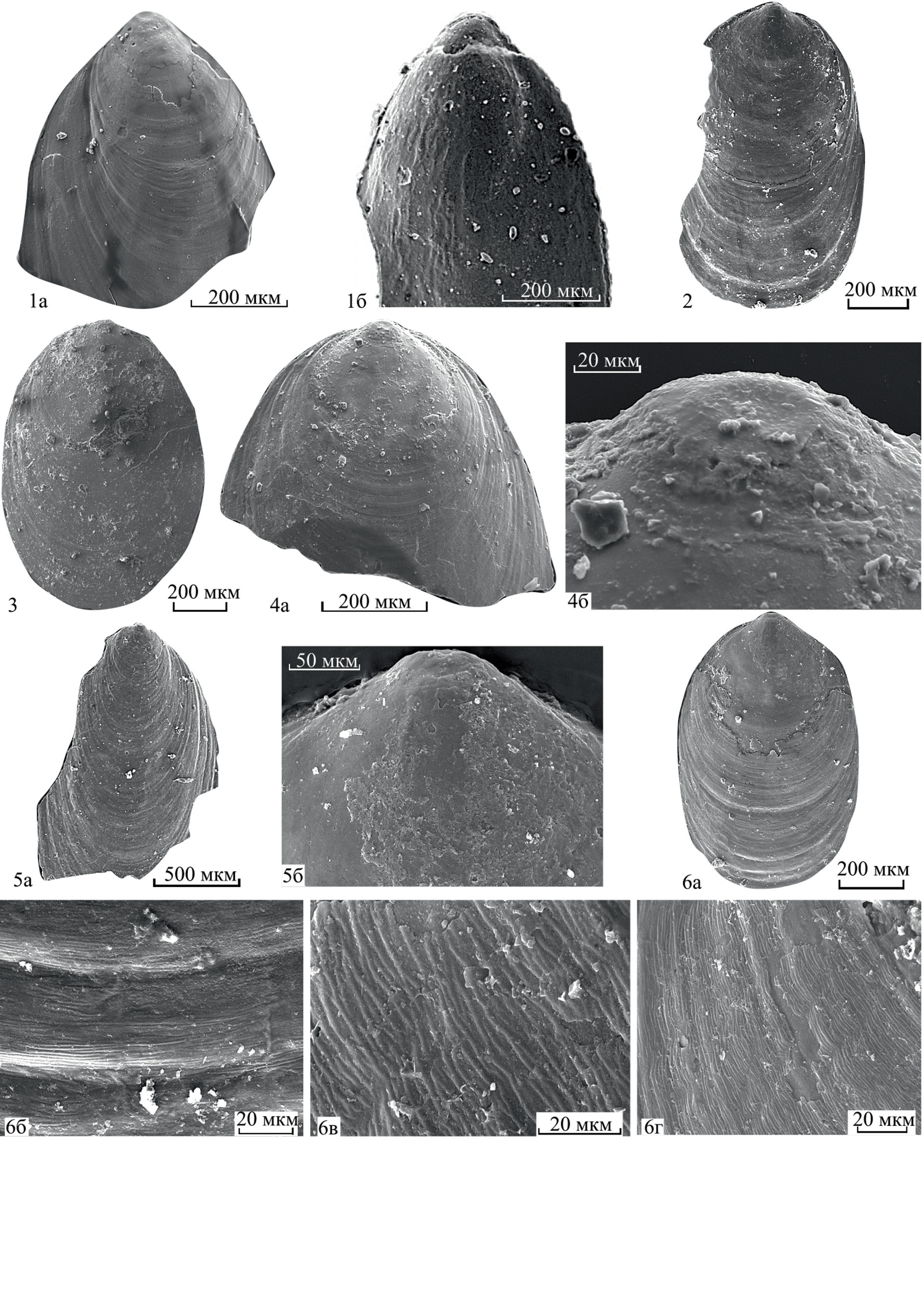 Фиг. 1–6. Lingulipora? sp.: 1 – экз. 712/1: 1а – спинная створка снаружи; 1б – брюшная створка снаружи, примакушечная часть обломана; 2 – экз. 712/2, спинная створка снаружи; 3 – экз. 712/3, спинная створка снаружи; 4 – экз. 712/4: 4а – спинная створка снаружи, в передней части обломана; 4б – примакушечная часть, протегулум; 5 – экз. 712/5: 5а – частично обломанная спинная створка снаружи; 5б – задняя часть створки – протегулум и часть брефической раковины; 6 – экз. 712/6: 6а – спинная створка снаружи; 6б – участок поверхности с концентрическими пластинами и струйками между ними; 6в – концентрические струйки на поверхности створки, видны отдельные выходы каналов-пор, 6г – поверхность створки с концентрическими пластинами, концы которых немного приподняты.