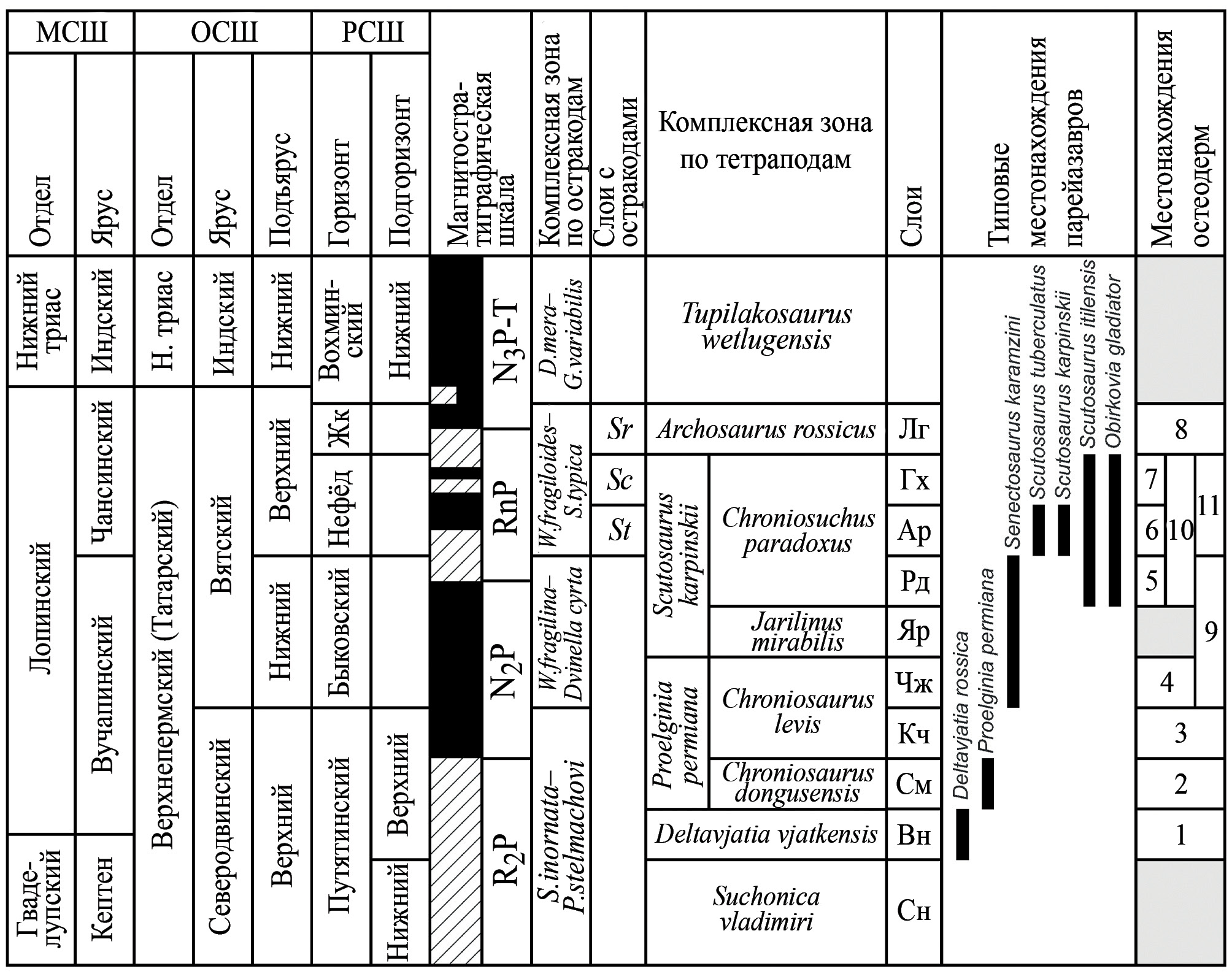 Рис. 1. Стратиграфическое положение местонахождений остеодерм парейазавров Восточной Европы. Высота прямоугольника охватывает стратиграфический интервал, в пределах которого расположено местонахождение. Местонахождения: 1 – Котельнич; 2 – Бабинцево-1, Кочевала-1, Микулино, Потеряха-2, Пуртовино, Семин Овраг-1, Чермянино; 3 – Мутовино, Марьюшкина Слуда-C; 4 – Агафоново, Преображенка-1A, Солоповка-2, Чижи; 5 – Климово-1, Саларево, Токари-2; 6 – Аристово, Завражье, Савватий, Соколки; 7 – Гороховец, Куверба, Пронькино, Раша, Элеонора; 8 – Быковка, Вязники-1, Жуков Овраг-1B, Пурлы; 9 – Преображенка-2; 10 – Аверинское-1, Аверинское-3, Адамовка, Блюменталь-3, Блюменталь-5, Болтинская, Вомба-Кассы, Вязовка-1, Ключевка, Ключевой Овраг, Обирково, Орлецы, Чащенка; 11 – Боевой-1. Сокращения: Ар – Аристовские, Гх – Гороховецкие, Вн – Ванюшонковские, Жк – Жуковский, Кептен – Кептенский, Кч – Кичугские, Лг – Лагерные, МСШ – Международная стратиграфическая шкала, Н. триас – Нижнетриасовый, Нефед – Нефедовский, ОСШ – Общая стратиграфическая шкала России, Рд – Ровдинские, РСШ – Региональная стратиграфическая шкала, См – Семинские, Сн – Сундырские, Чж – Чижевские, Яр – Ярильские, D. – Darwinula, G. – Gerdalia, P. – Prasuchonella, S.inornata – Suchonellina inornata, S.typica – Suchonella typica, St – Suchonella typica, Sc – Suchonella clivosa, Sr – Suchonella rykovi, W. – Wjatkellina.