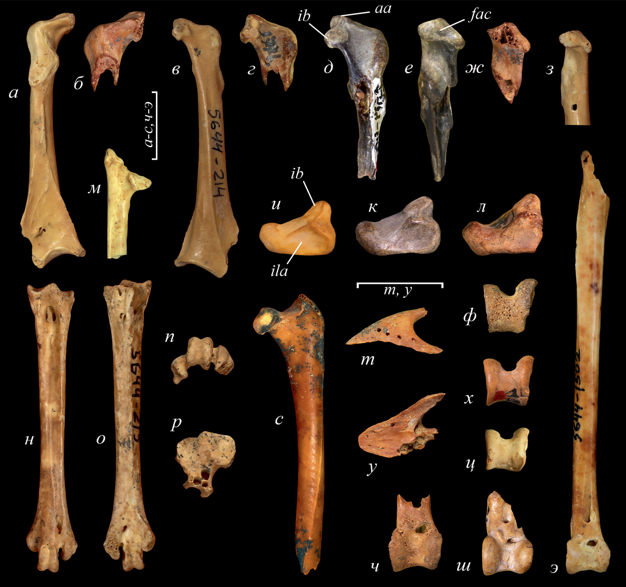 Рис. 1. Кости крыла современных и ископаемых Perdicini s. s.: а, л – Alectoris graeca (Meisner, 1804), современный; б, е, и, м, т, у, ц – Enkuria voinstvenskyi gen. et sp. nov., нижний плейстоцен пещеры Таврида (Крым): б, е, и, м – голотип ПИН, № 5644/1520, левая плечевая кость; т, у, ц – экз. ПИН, № 5644/1519, правый карпометакарпус; в, г, ж, н, о, р, с, ф, ч, ш – Perdix jurcsaki Kretzoi, 1962, нижний плейстоцен пещеры Таврида (Крым): в, ж – экз. ПИН, № 5644/1516, неполная левая плечевая кость (крупный экземпляр); г – экз. ПИН, № 5644/217, проксимальный фрагмент правой плечевой кости (мелкий экземпляр); н – экз. ПИН, № 5644/1511, дистальный фрагмент левой плечевой кости; о – экз. ПИН, № 5644/1768, левая локтевая кость; р – экз. ПИН, № 5644/1761, базальная фаланга большого пальца крыла; с, ф, ч – экз. ПИН, № 5644/1747, правый карпометакарпус (крупный экземпляр); ш – экз. ПИН, № 5644/1780, правый карпометакарпус (мелкий экземпляр); э – P. jurcsaki Kretzoi, 1962, экз. NMNHU-P 41–493, фрагментарный левый карпометакарпус; местонахождение Крыжановка-2; Украина; д – P. inferna (Kurochkin, 1985), экз. ПИН, № 2975/101, правая плечевая кость (голотип Perdix margaritae Kurochkin, 1985; отражен), верхний плиоцен Забайкалья; з – Francolinus francolinus (L., 1766), современный; к, п – Perdix perdix (L., 1758), современный; а–д – с каудальной стороны; е–з, у, ф – с дорсальной стороны; и, к – с дистальной стороны; л–н, с, т – с краниальной стороны; о–р, ц–э – с вентральной стороны. Обозначения: cdf – crus dorsale fossae; ch – caput humeri; con – вогнутость в дорсальном профиле crista deltopectoralis; ev – epicondylus ventralis; f – отверстия, оставленные хищными птицами; fpt – fossa pneumotricipitalis; ftd – дорсальная триципитальная фосса; ih – intumescentia humeri; l – дистальный “язычок” головки плечевой кости; mam – большая метакарпалия; mim – малая метакарпалия; pf – processus flexorius; pi – processus intermetacarpalis; pp – processus pisiformis; стрелками обозначено дно дорсальной триципитальной фоссы на уровне crus dorsale fossae. Длина масштабной линейки – 10 мм.