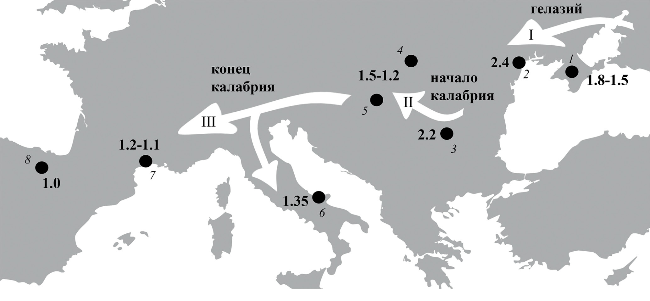 Рис. 3. Распространение Perdix jurcsaki в плейстоцене Европы. Указаны местонахождения (курсивом) и возраст в млн лет. Римскими цифрами обозначены хронологические этапы дисперсий. Обозначения: 1 – Таврида (Крым); 2 – Крыжановка 2 (Северное Причерноморье, Украина); 3 – Выршец (Болгария); 4 – Бетфия 2, 9 (Румыния); 5 – Беременд 16–17 (Венгрия); 6 – Пирро Норд (Италия); 7 – Ма Рамбо (Франция); 8 – Элефанте (Испания).