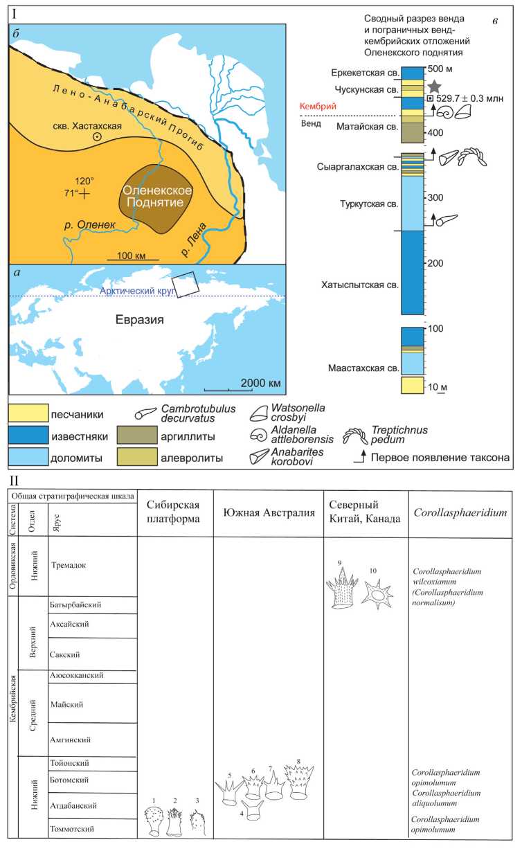 Рис. 1. Географическое положение, стратиграфическая колонка и стратиграфическое распределение микрофоссилий рода Corollasphaeridium: I – географическое положение и стратиграфическая колонка: а – изучаемая местность (в квадрате), б – местоположение Оленекского поднятия, в – сводная стратиграфическая колонка (по: Grazhdankin et al., 2020, с изменениями); II – распределение микрофоссилий рода Corollasphaeridium по миру: 1–3 – сибирский материал, отнесенный в данной работе к Spicaticampaniformis gen. nov.; 4–8 – австралийский материал: 4, 5 – S. aliquolumus, 6–8 – S. opimolumus; 9, 10 – китайский и канадский материал по Corollasphaeridium wilcoxianum (10 –C. normalisum по: Gravestock et al., 2001).