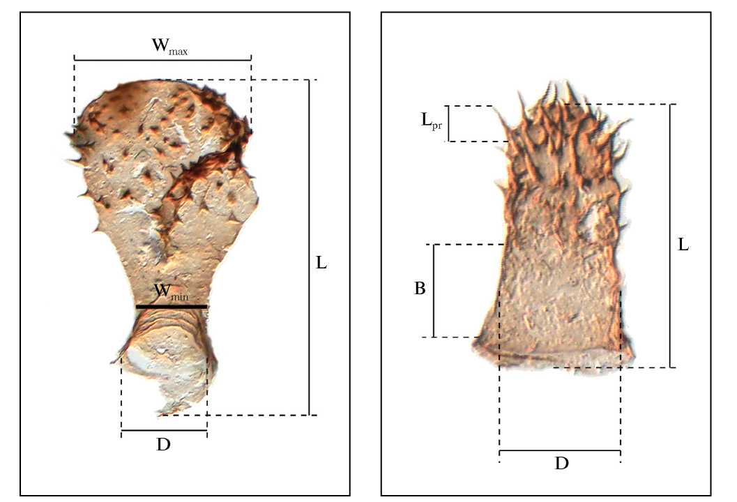 Рис. 2. Обозначение измеряемых величин на микрофоссилиях: L – длина, Lpr – длина выроста, Wmax – максимальная ширина, Wmin – минимальная ширина, D – диаметр базального отверстия, B – высота базальной части.